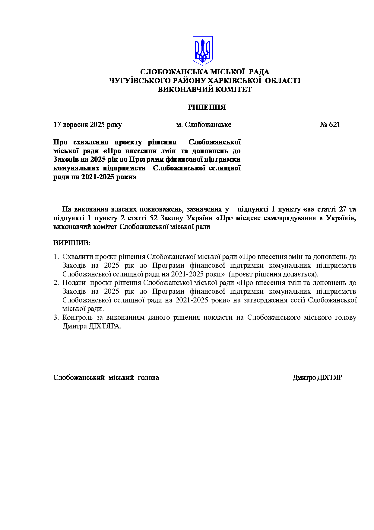 Рішення виконавчого комітету №621 Про схвалення проєкту рішення Слобожанської міської ради «Про внесення змін та доповнень до Заходів на 2025 рік до Програми фінансової підтримки комунальних підприємств Слобожанської селищної ради на 2021-2025 роки».