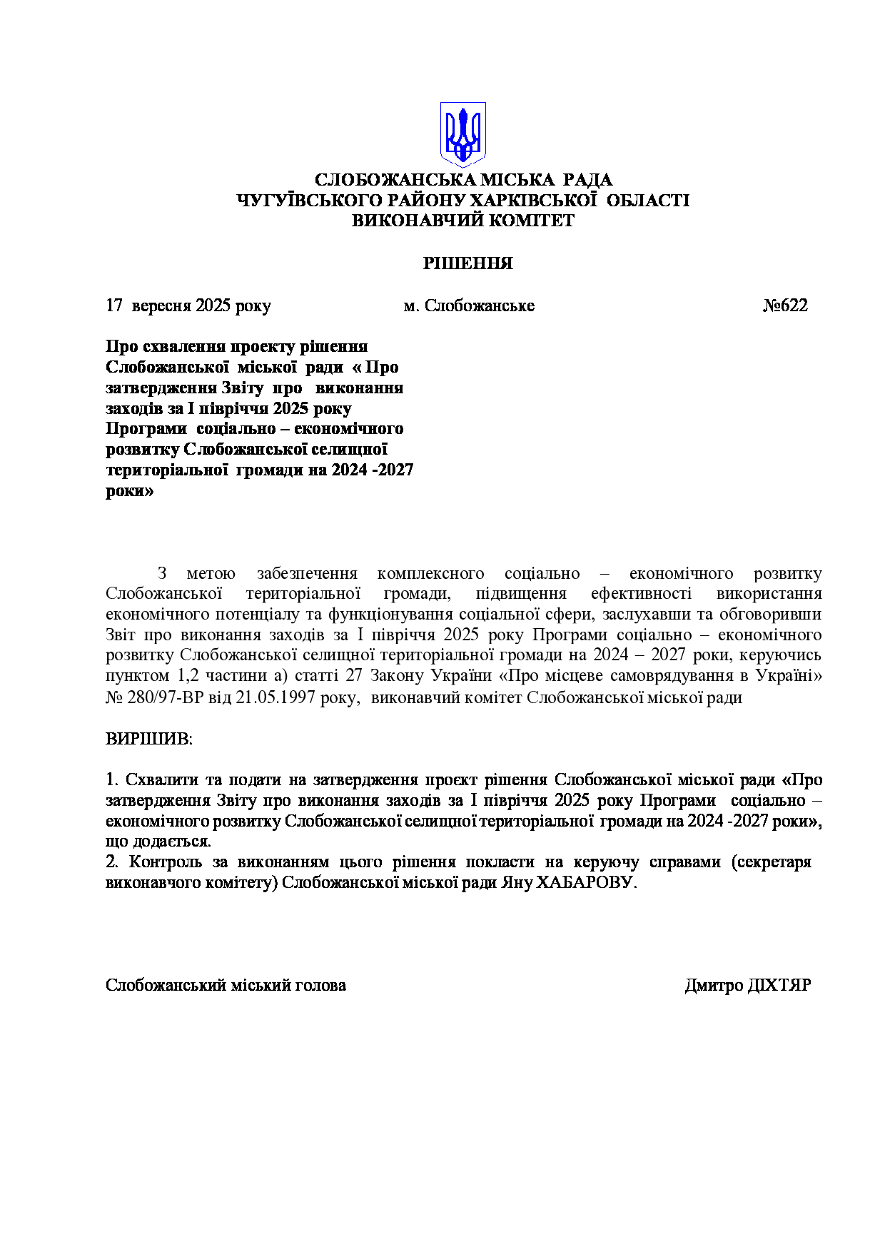 Рішення виконавчого комітету №622 Про схвалення проекту рішення Слобожанської міської ради «Про затвердження Звіту про виконання заходів за I півріччя 2025 року Програми соціально – економічного розвитку Слобожанської селищної територіальної громади на 2024 -2027 роки».