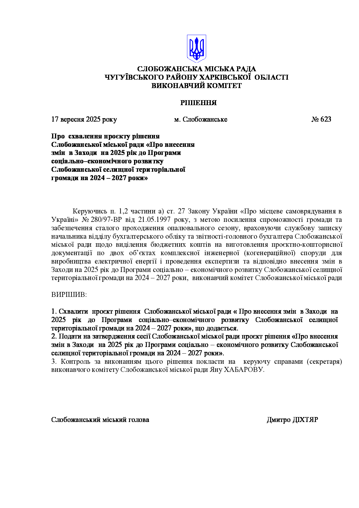 Рішення виконавчого комітету №623 Про схвалення проєкту рішення Слобожанської міської ради «Про внесення змін в Заходи на 2025 рік до Програми соціально–економічного розвитку Слобожанської селищної територіальної громади на 2024 – 2027 роки».