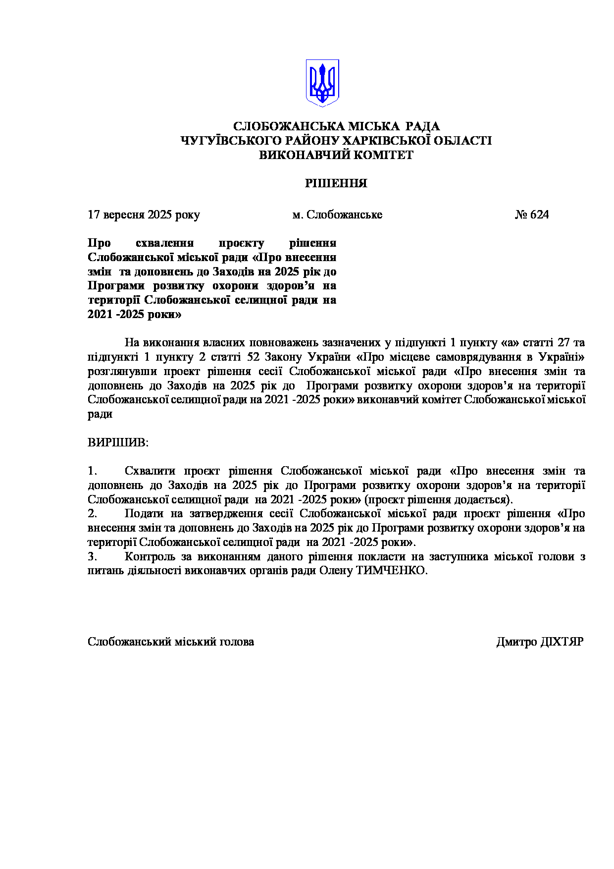 Рішення виконавчого комітету №624 Про схвалення проєкту рішення Слобожанської міської ради «Про внесення змін та доповнень до Заходів на 2025 рік до Програми розвитку охорони здоров’я на території Слобожанської селищної ради на 2021 -2025 роки».
