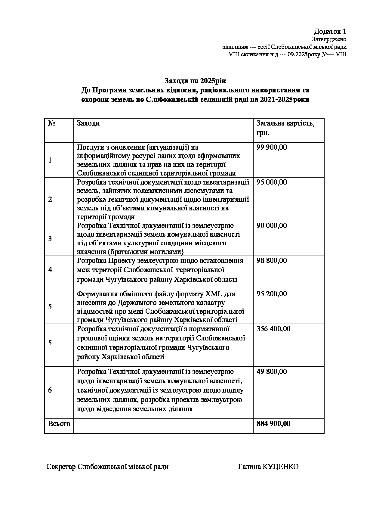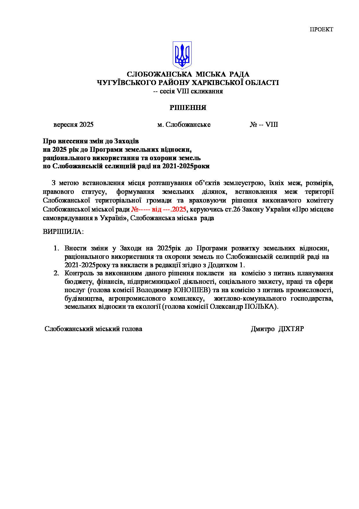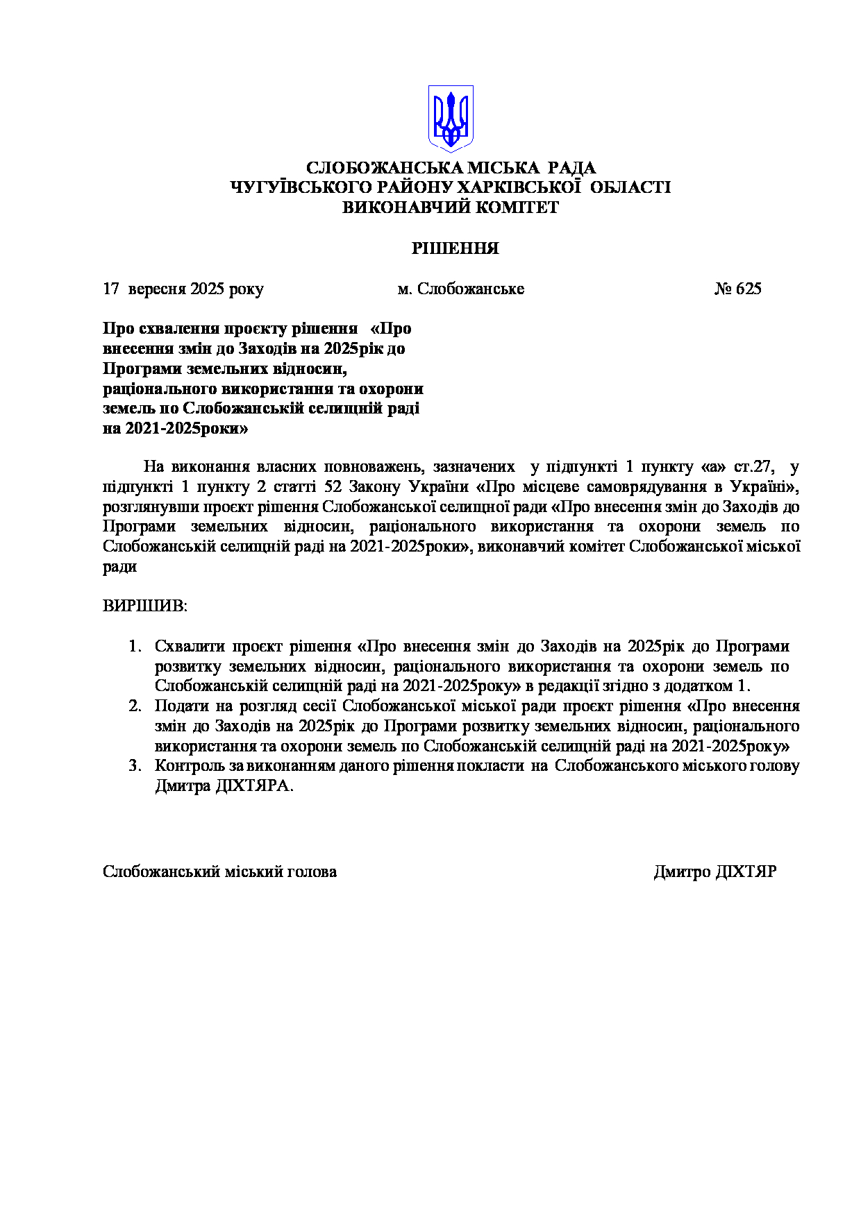 Рішення виконавчого комітету №625 Про схвалення проєкту рішення «Про внесення змін до Заходів на 2025рік до Програми земельних відносин, раціонального використання та охорони земель по Слобожанській селищній раді на 2021-2025роки».