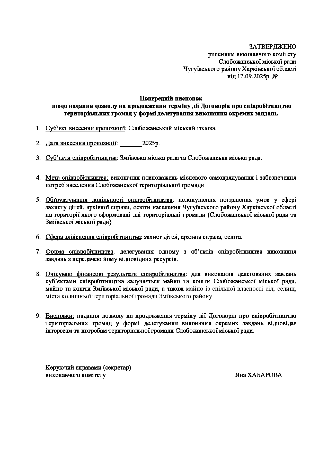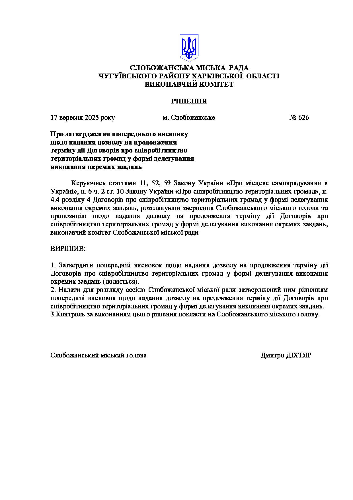 Рішення виконавчого комітету №626 Про затвердження попереднього висновку щодо надання дозволу на продовження терміну дії Договорів про співробітництво територіальних громад у формі делегування виконання окремих завдань.