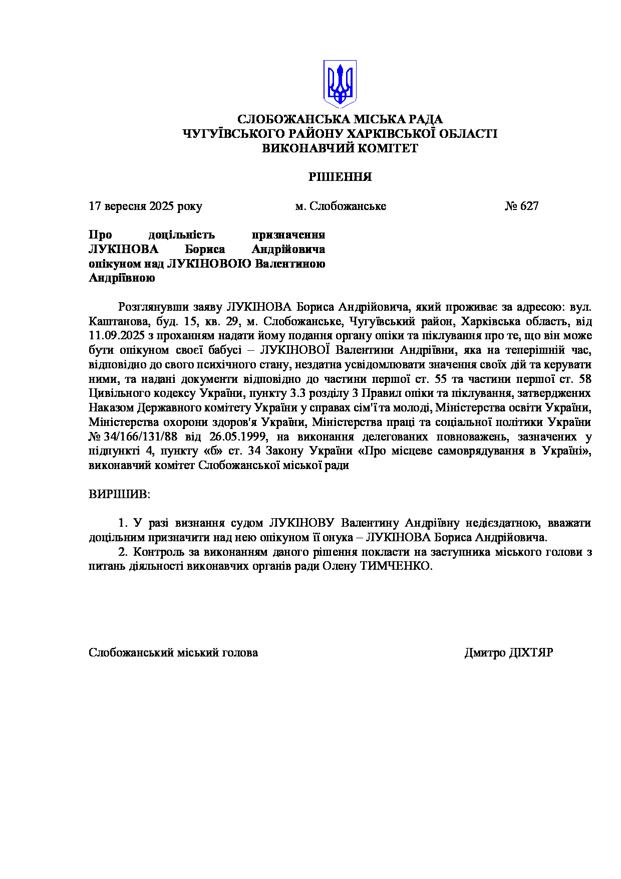 Рішення виконавчого комітету №627 Про доцільність призначення *** опікуном над ***