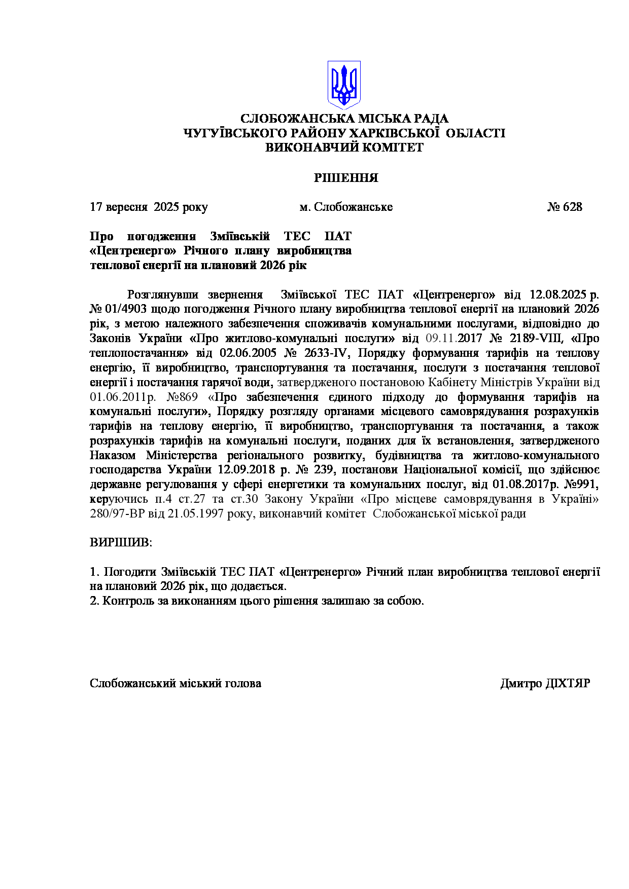 Рішення виконавчого комітету №628 Про погодження Зміївській ТЕС ПАТ «Центренерго» Річного плану виробництва теплової енергії на плановий 2026 рік.