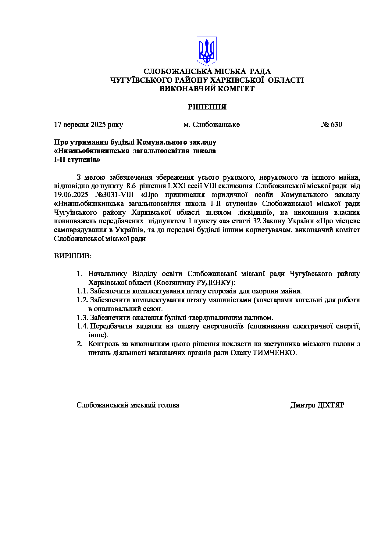 Рішення виконавчого комітету №630 Про утримання будівлі Комунального закладу «Нижньобишкинська загальноосвітня школа І-ІІ ступенів».