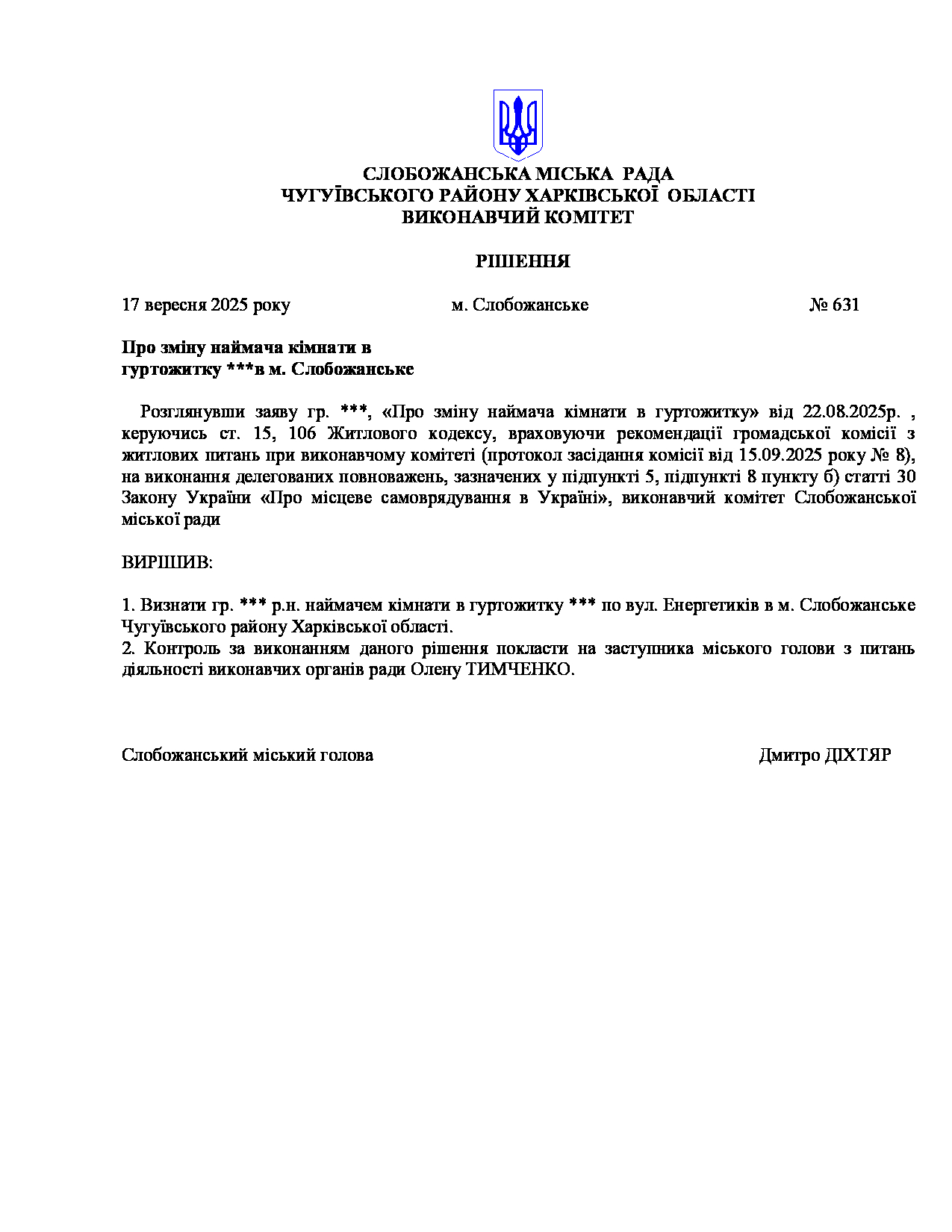 Рішення виконавчого комітету №631 Про зміну наймача кімнати в гуртожитку **** в м. Слобожанське.