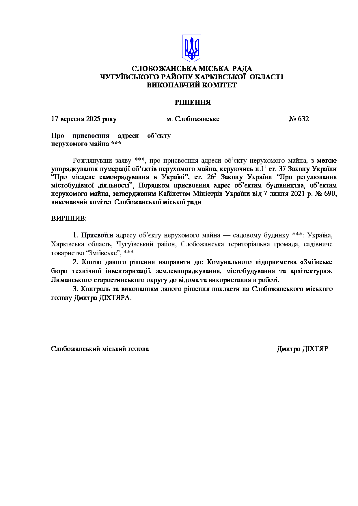 Рішення виконавчого комітету №632 Про присвоєння адреси об’єкту нерухомого майна ***