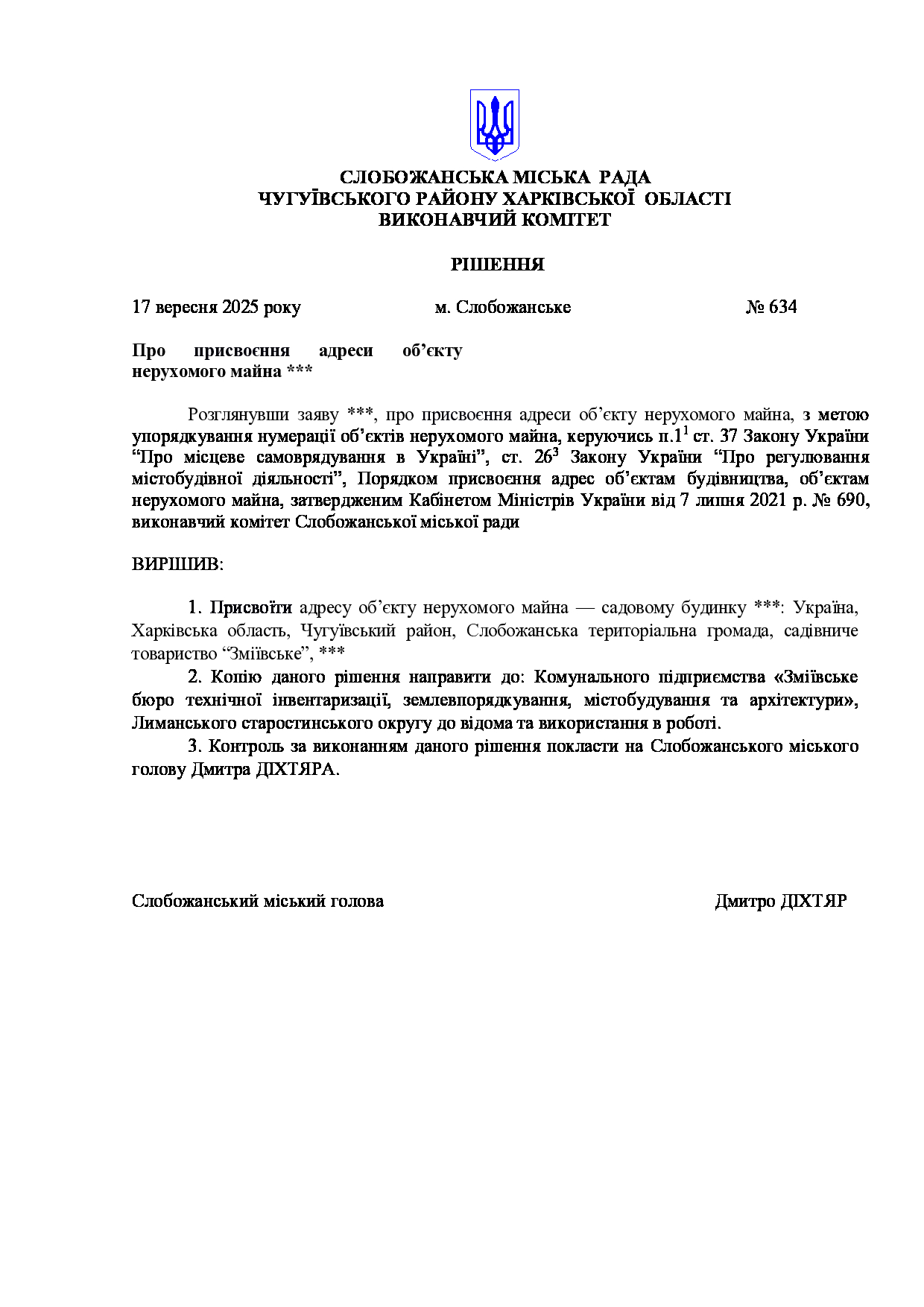 Рішення виконавчого комітету №634 Про присвоєння адреси об’єкту нерухомого майна ***