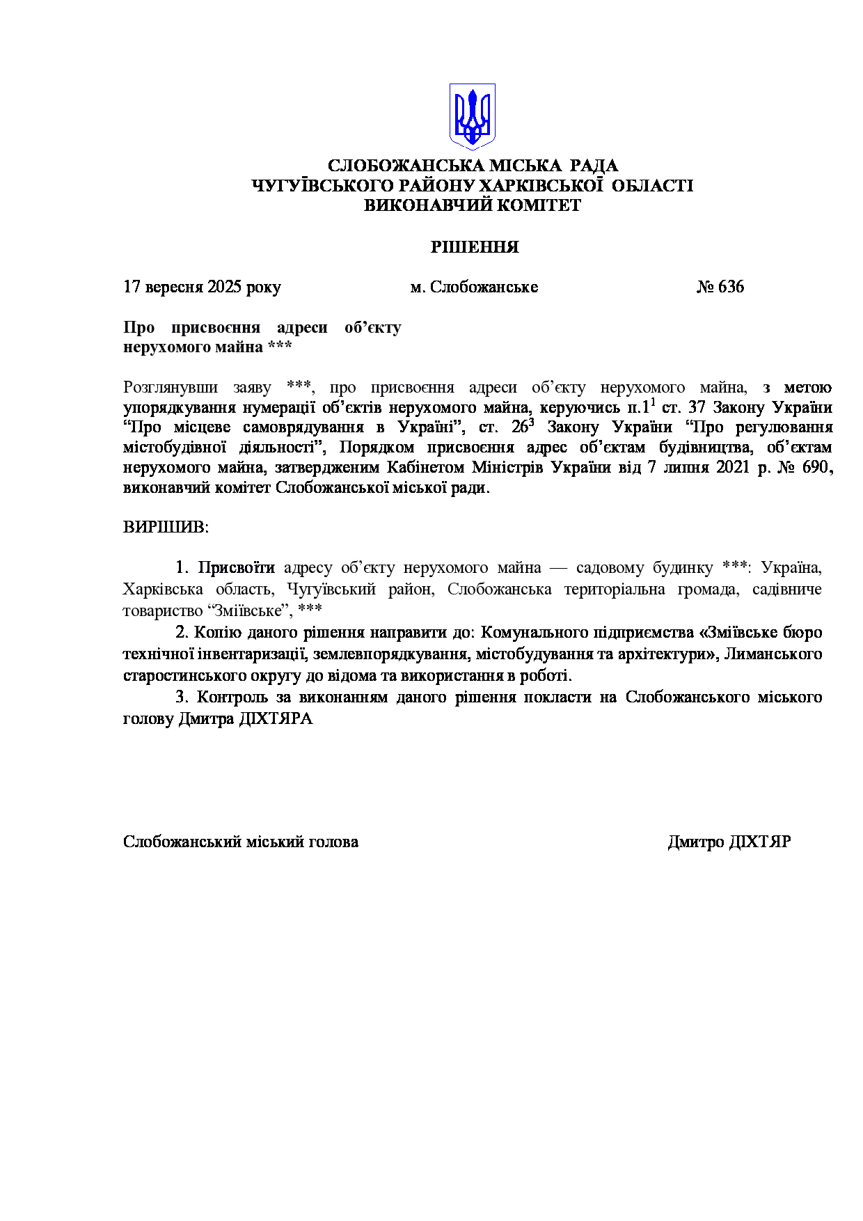 Рішення виконавчого комітету №636 Про присвоєння адреси об’єкту нерухомого майна ***