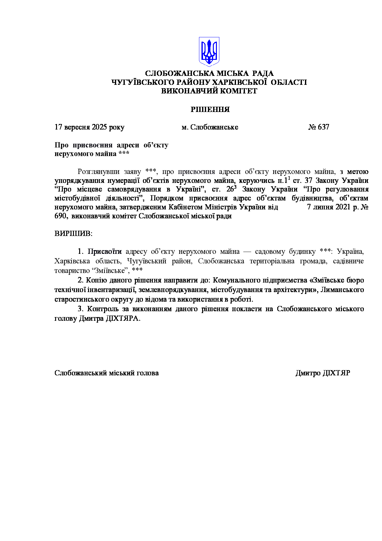Рішення виконавчого комітету №637 Про присвоєння адреси об’єкту нерухомого майна ***