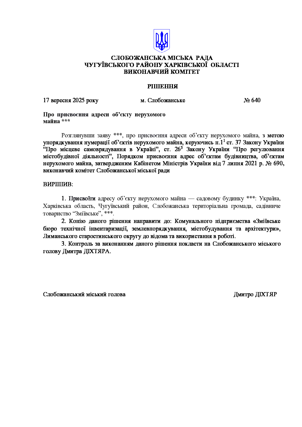 Рішення виконавчого комітету №640 Про присвоєння адреси об’єкту нерухомого майна ***