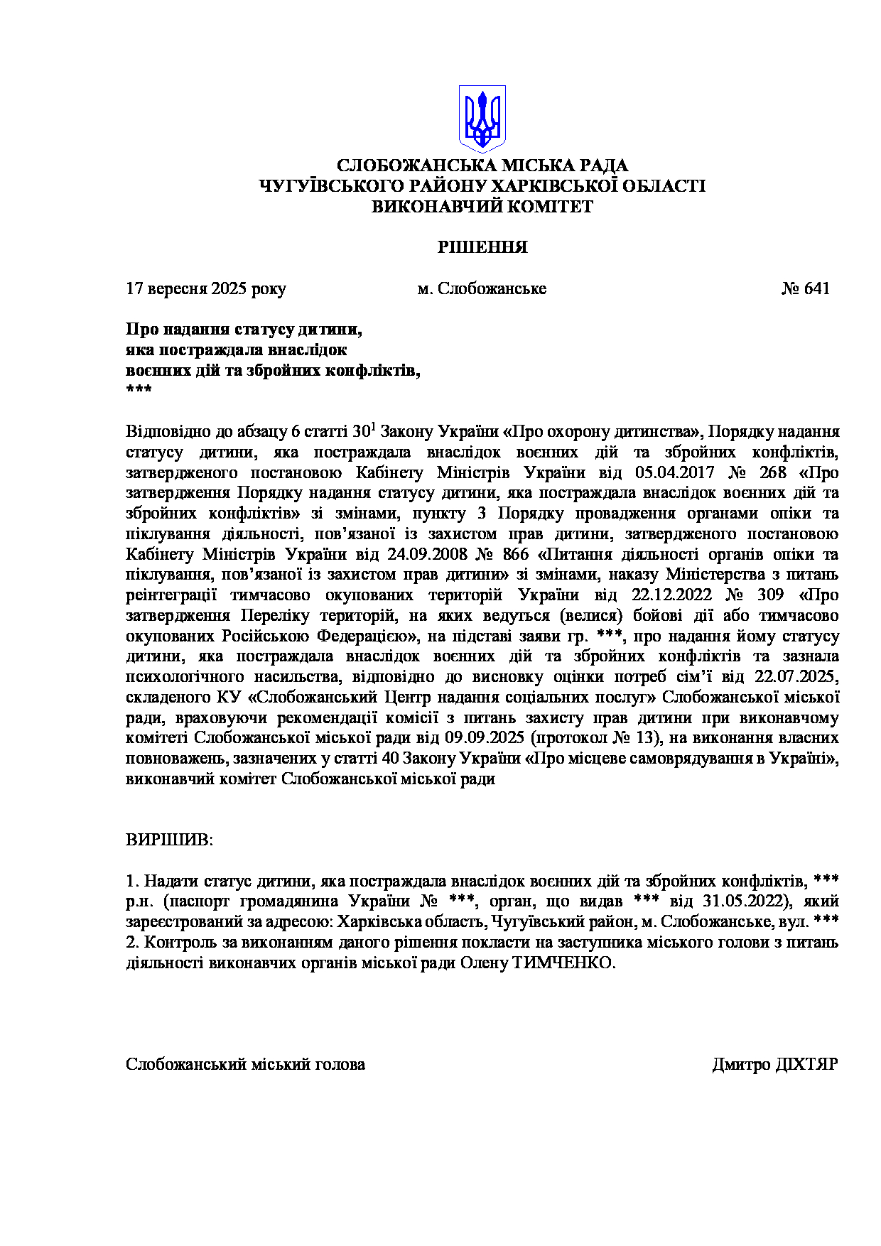 Рішення виконавчого комітету №641 Про надання статусу дитини, яка постраждала внаслідок воєнних дій та збройних конфліктів, ***