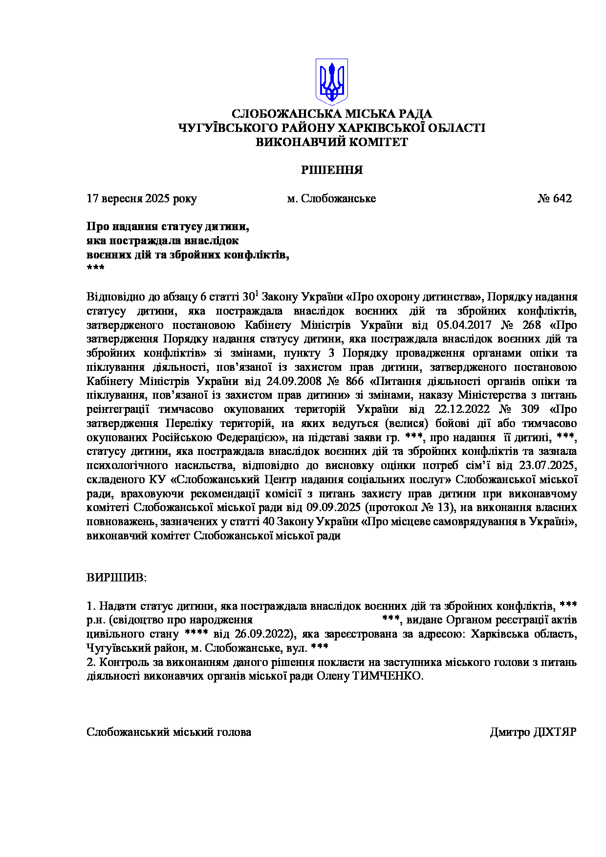 Рішення виконавчого комітету №642 Про надання статусу дитини, яка постраждала внаслідок воєнних дій та збройних конфліктів, ***