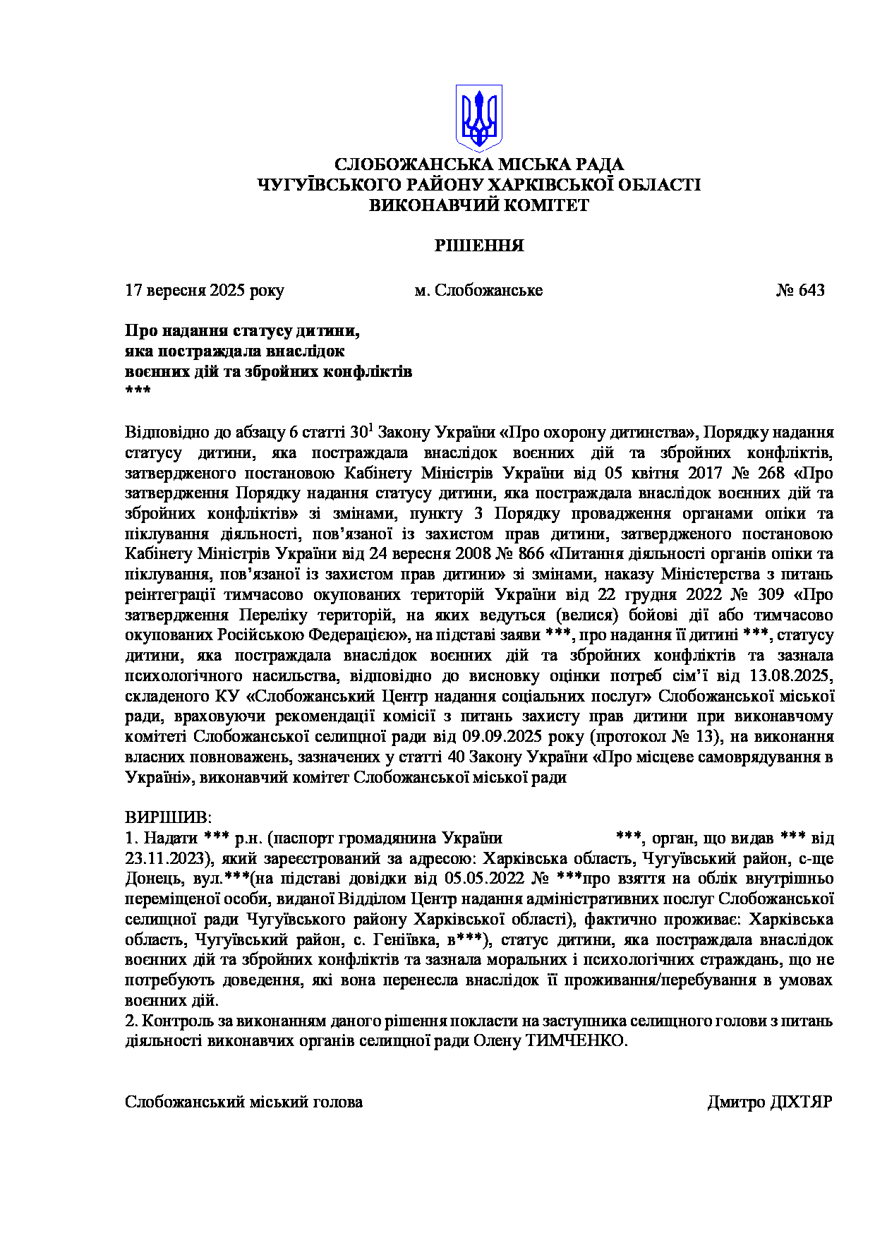 Рішення виконавчого комітету №643 Про надання статусу дитини, яка постраждала внаслідок воєнних дій та збройних конфліктів, ****
