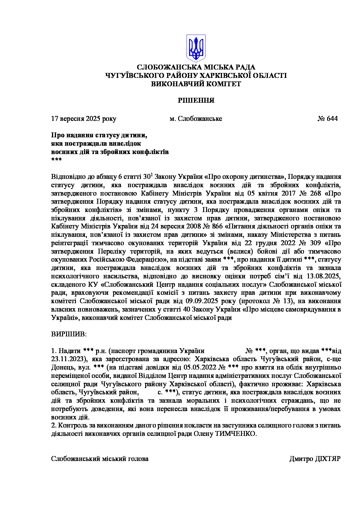 Рішення виконавчого комітету №644 Про надання статусу дитини, яка постраждала внаслідок воєнних дій та збройних конфліктів, ***
