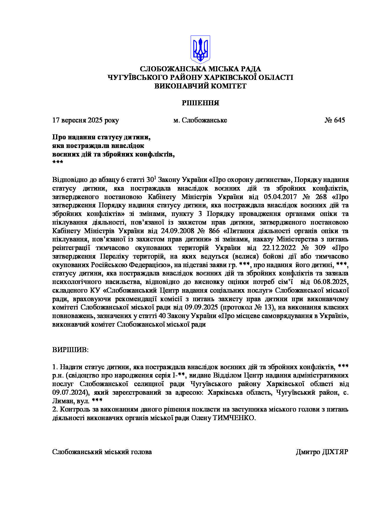Рішення виконавчого комітету №645 Про надання статусу дитини, яка постраждала внаслідок воєнних дій та збройних конфліктів, ***