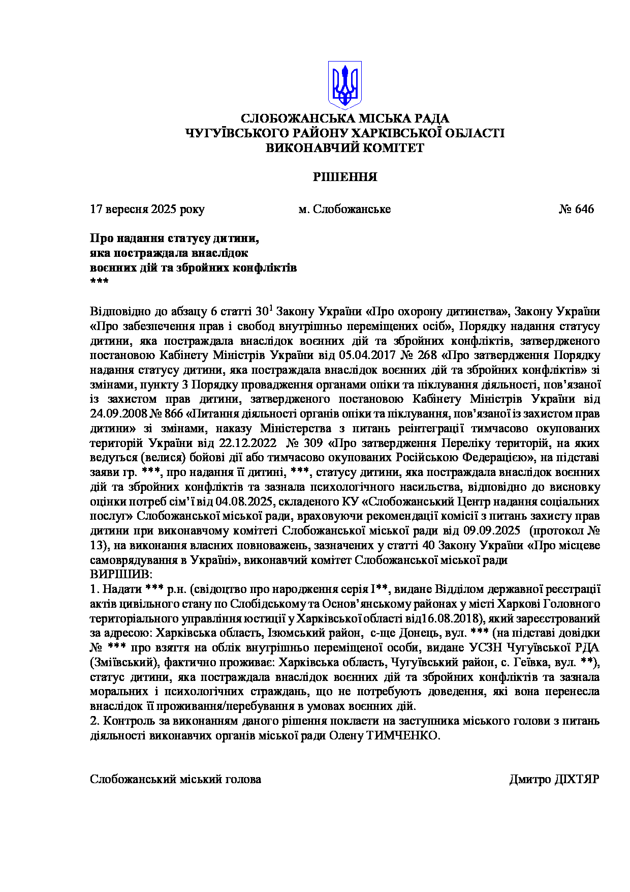 Рішення виконавчого комітету №646 Про надання статусу дитини, яка постраждала внаслідок воєнних дій та збройних конфліктів, ***