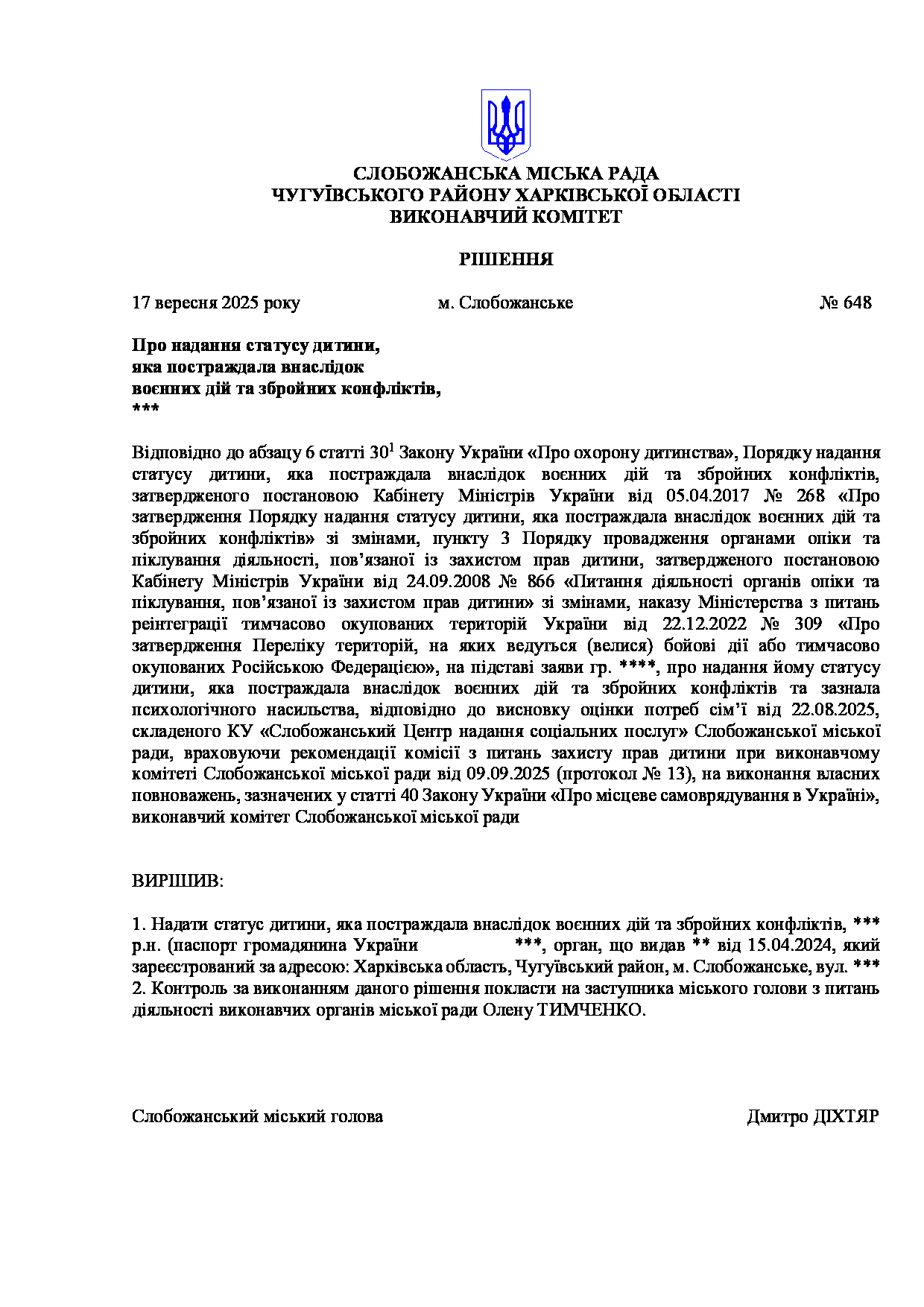 Рішення виконавчого комітету №648 Про надання статусу дитини, яка постраждала внаслідок воєнних дій та збройних конфліктів, ***