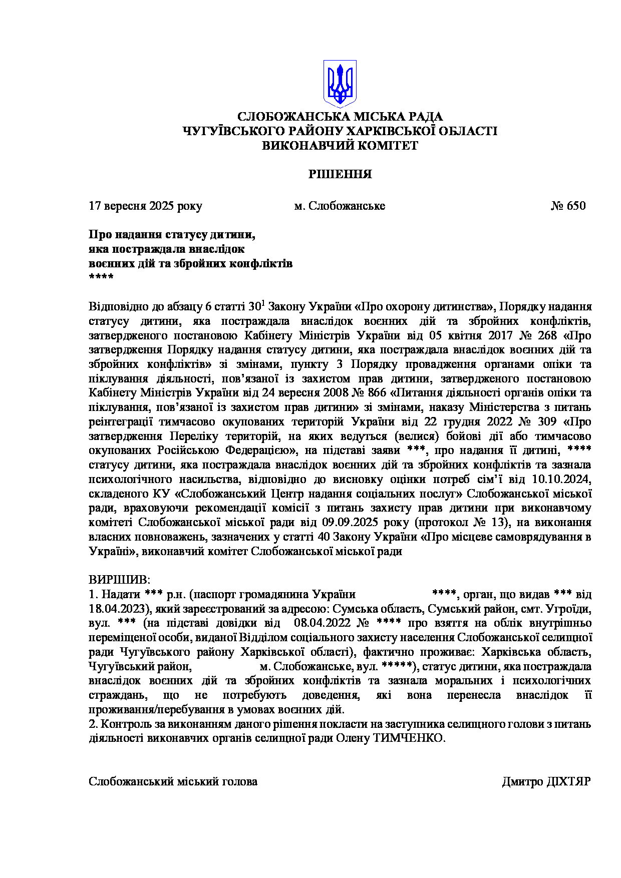 Рішення виконавчого комітету №650 Про надання статусу дитини, яка постраждала внаслідок воєнних дій та збройних конфліктів, ***