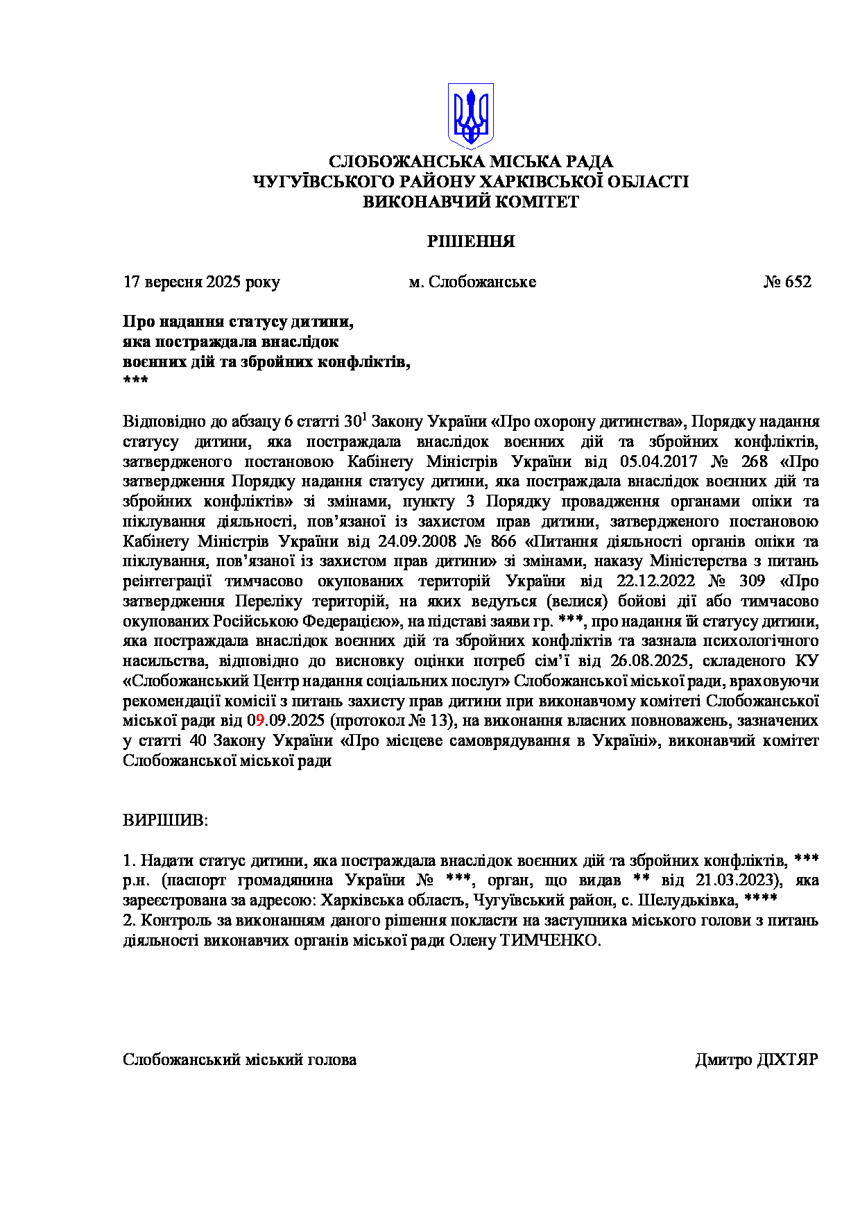 Рішення виконавчого комітету №652 Про надання статусу дитини, яка постраждала внаслідок воєнних дій та збройних конфліктів, ***