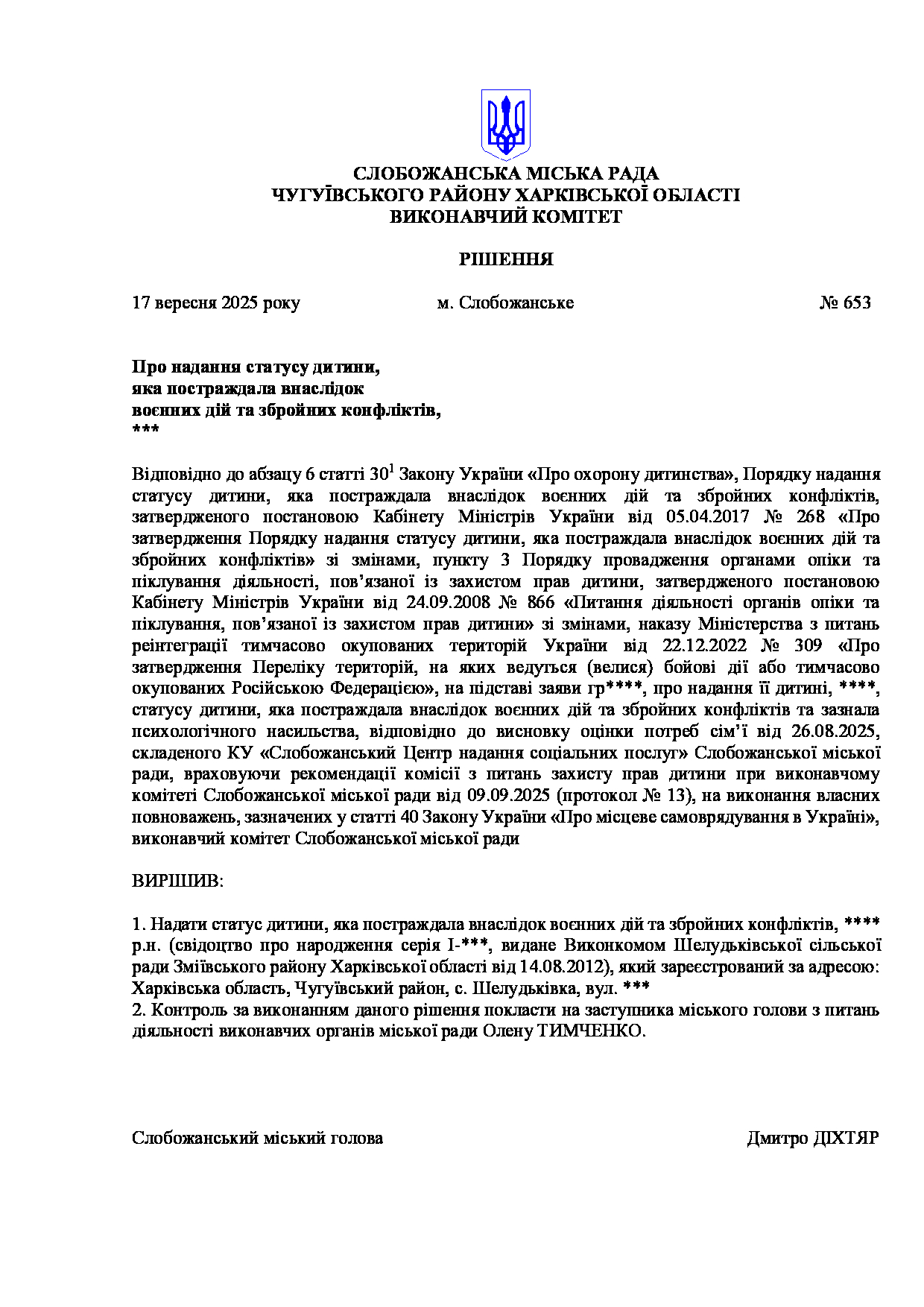 Рішення виконавчого комітету №653 Про надання статусу дитини, яка постраждала внаслідок воєнних дій та збройних конфліктів, ***