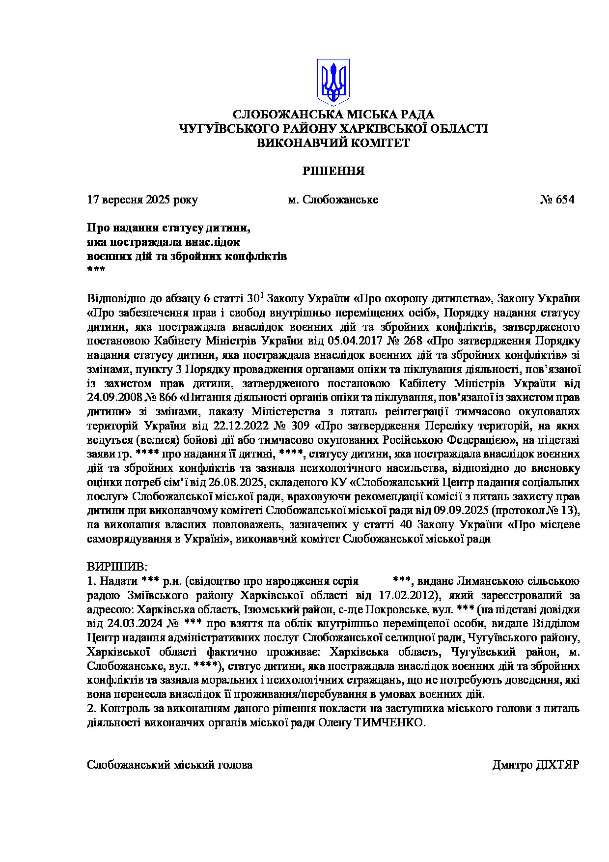 Рішення виконавчого комітету №654 Про надання статусу дитини, яка постраждала внаслідок воєнних дій та збройних конфліктів, ***