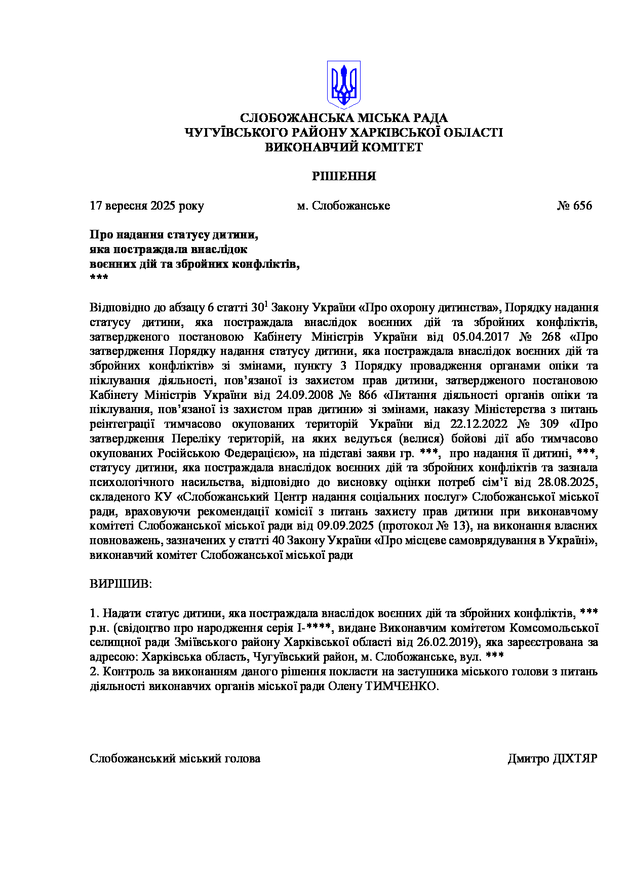 Рішення виконавчого комітету №656 Про надання статусу дитини, яка постраждала внаслідок воєнних дій та збройних конфліктів, ***