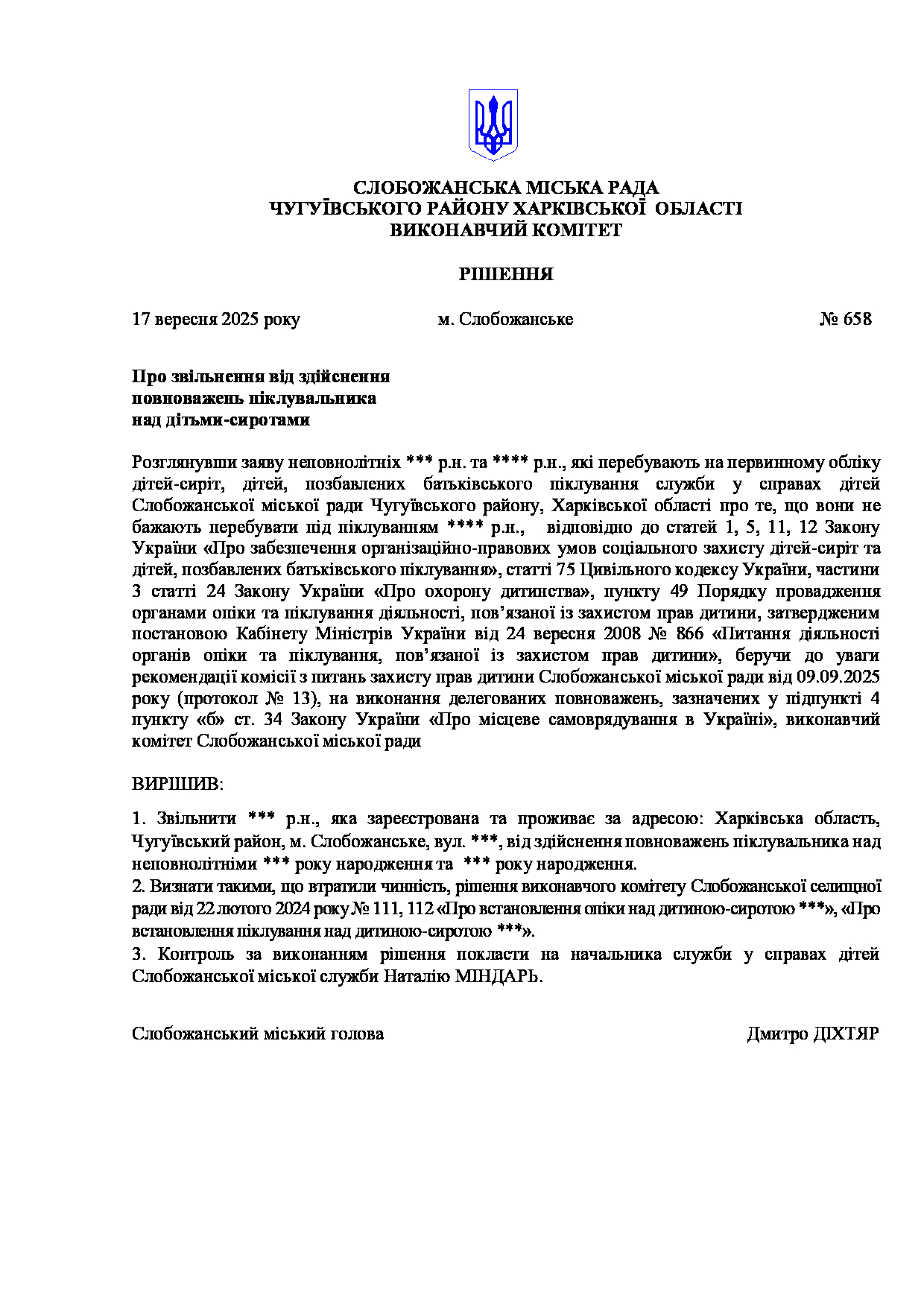 Рішення виконавчого комітету №658 Про звільнення від здійснення повноважень піклувальника над дітьми-сиротами.