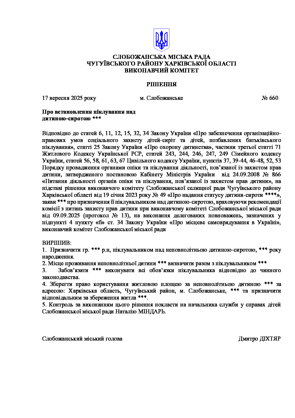 Рішення виконавчого комітету №660 Про встановлення піклування над дитиною-сиротою ***