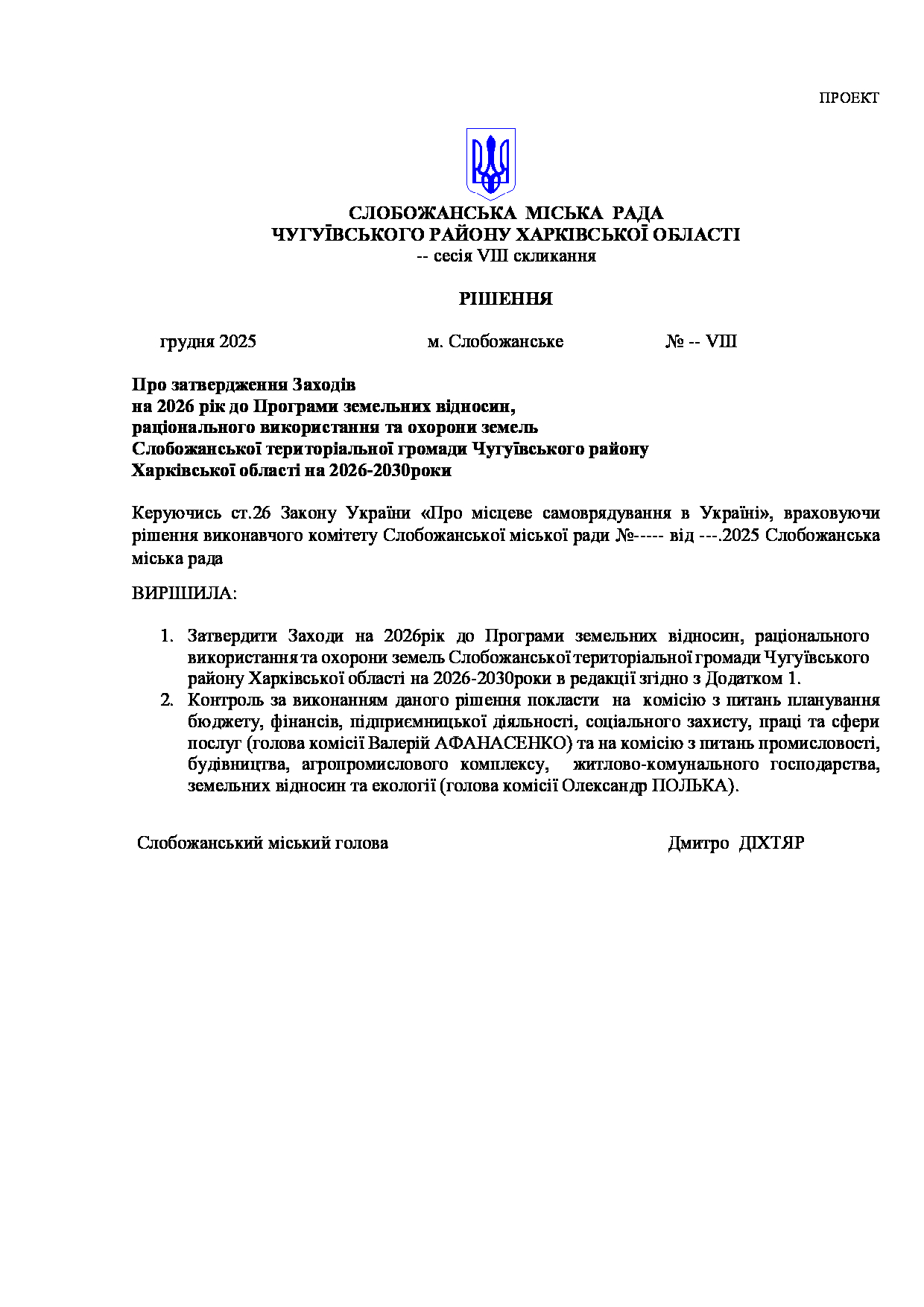 Рішення виконавчого комітету №840 Про схвалення проєкту рішення «Про затвердження Заходів на 2026 рік до Програми земельних відносин, раціонального використання та охорони земель Слобожанської міської територіальної громади Чугуївського району Харківської області на 2026-2030роки».