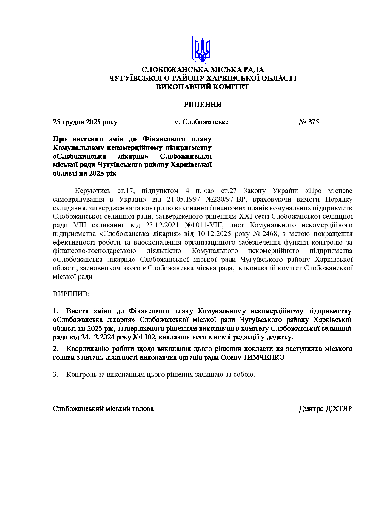 Рішення виконавчого комітету №875 Про внесення змін до Фінансового плану Комунальному некомерційному підприємству «Слобожанська лікарня» Слобожанської міської ради Чугуївського району Харківської області на 2025 рік .
