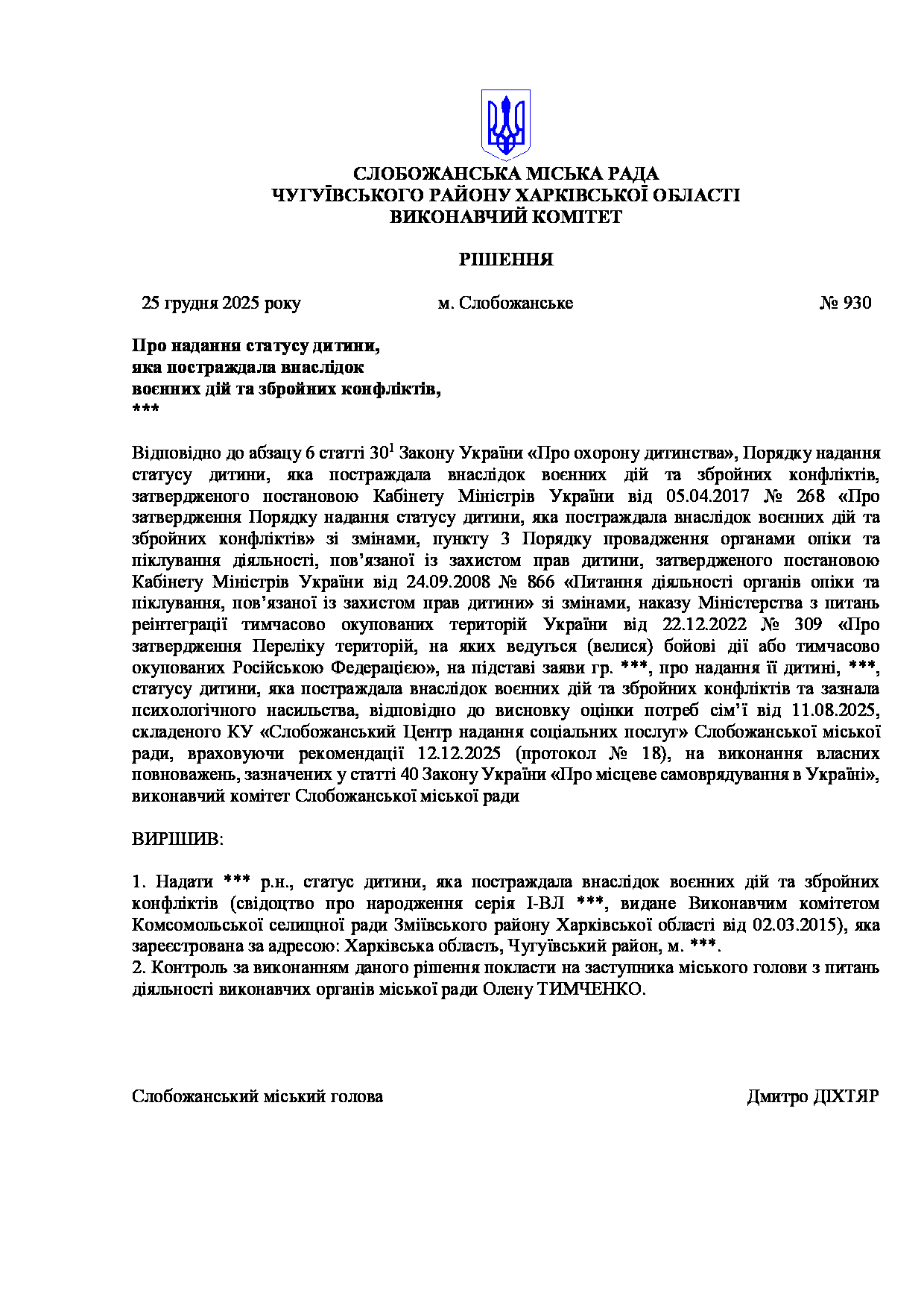 Рішення виконавчого комітету №930 Про надання статусу дитини, яка постраждала внаслідок воєнних дій та збройних конфліктів, ***.