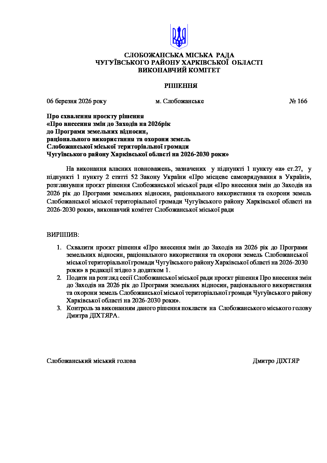 Рішення виконавчого комітету №166 Про схвалення проєкту рішення «Про внесення змін до Заходів на 2026рік до Програми земельних відносин, раціонального використання та охорони земель Слобожанської міської територіальної громади Чугуївського району Харківської області на 2026-2030 роки».