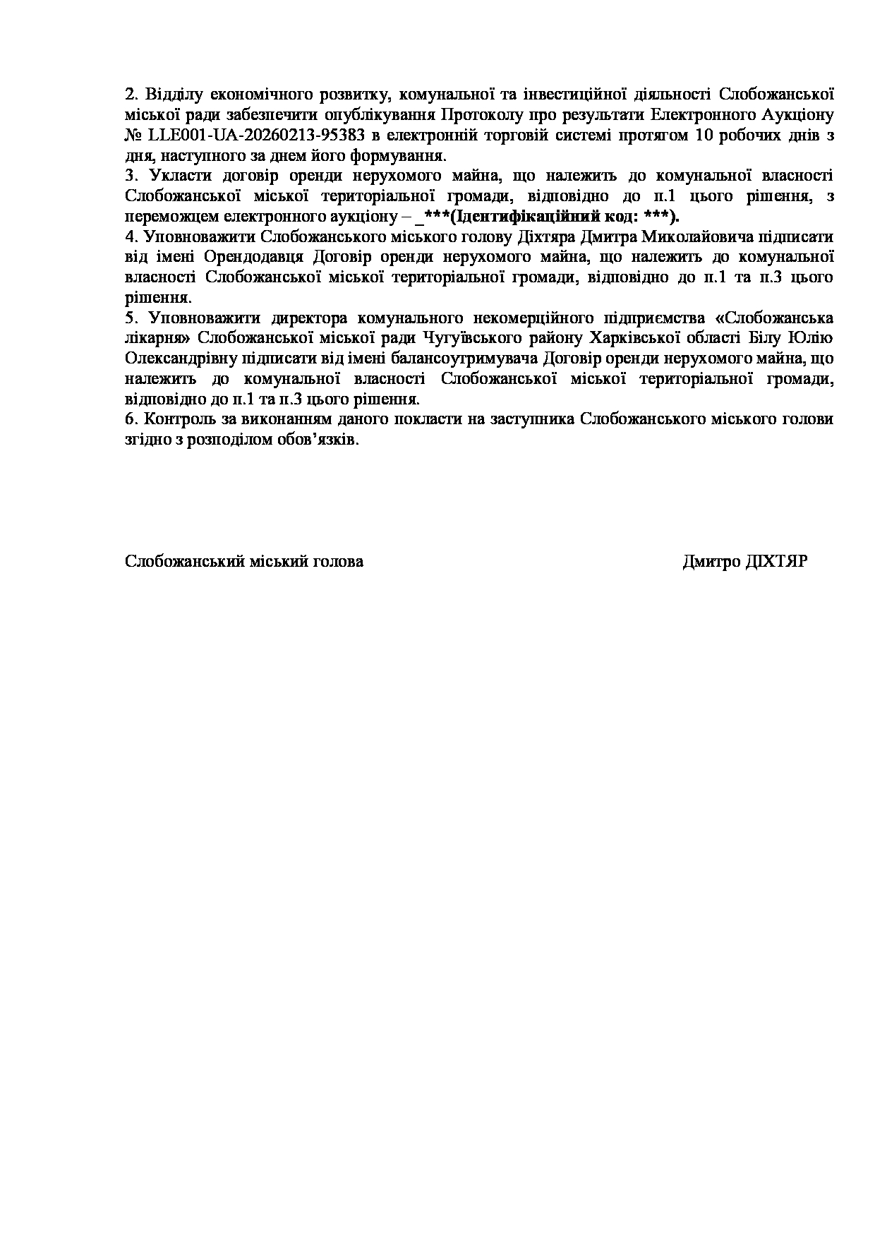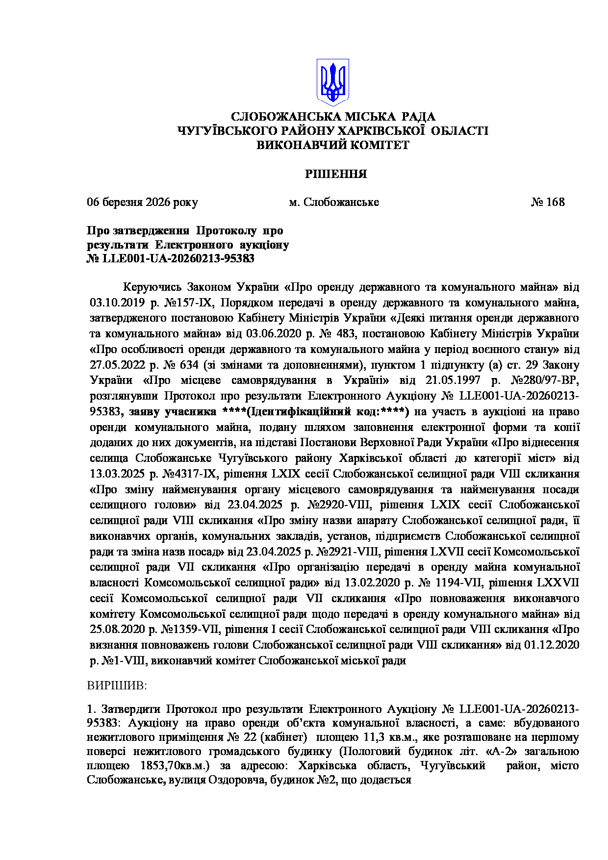 Рішення виконавчого комітету №168 Про затвердження Протоколу про результати Електронного аукціону № LLE001-UA-20260213-95383.