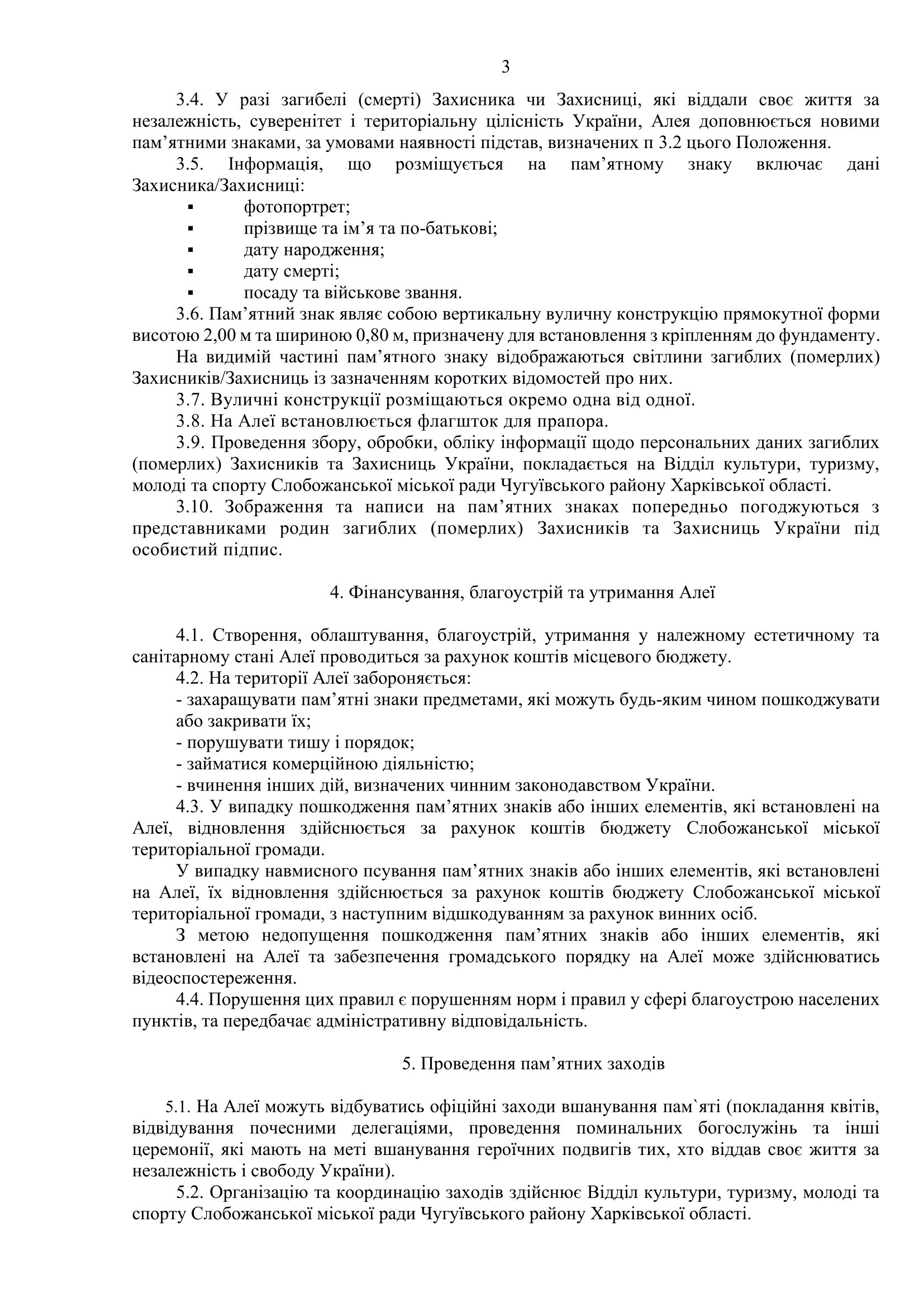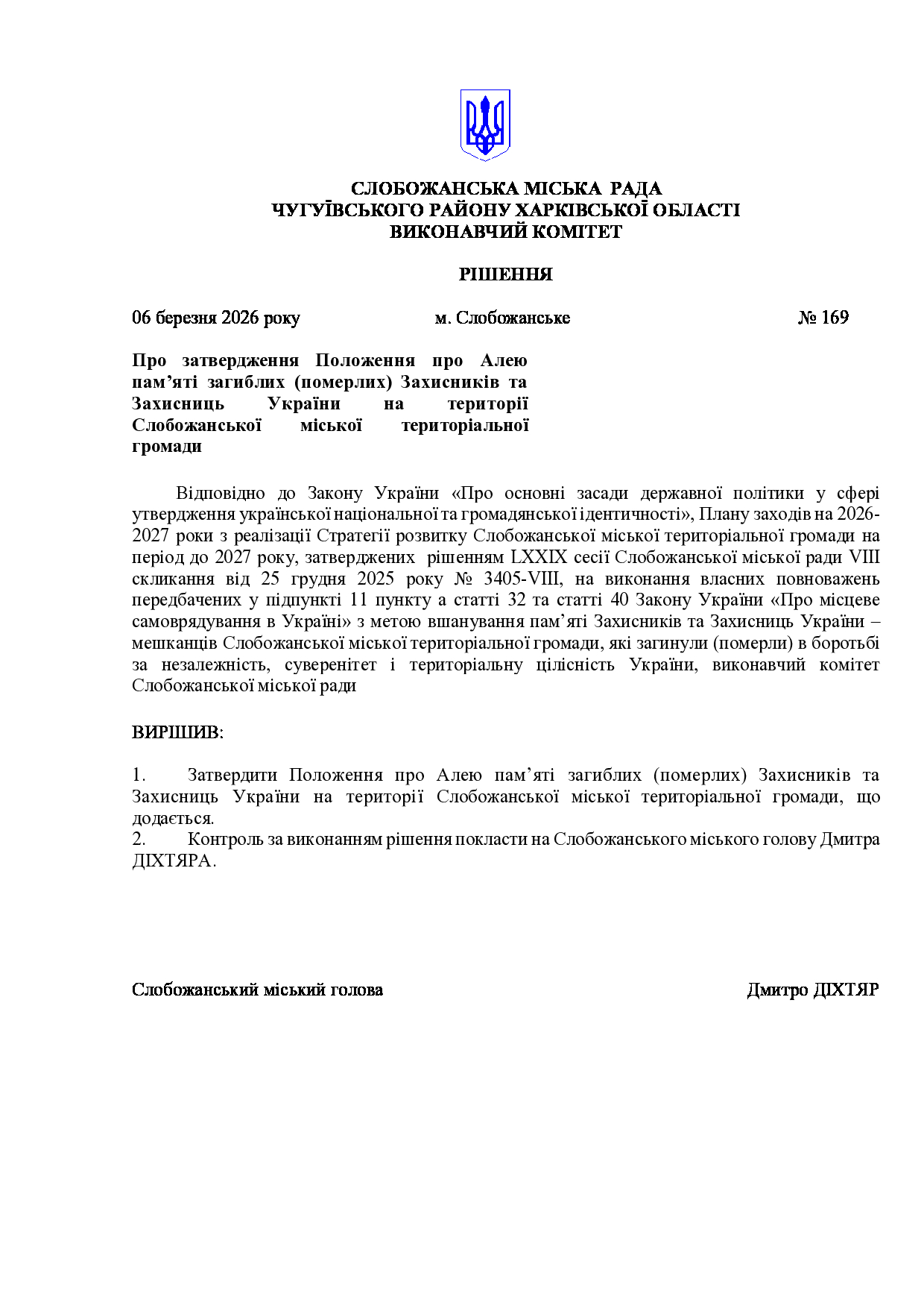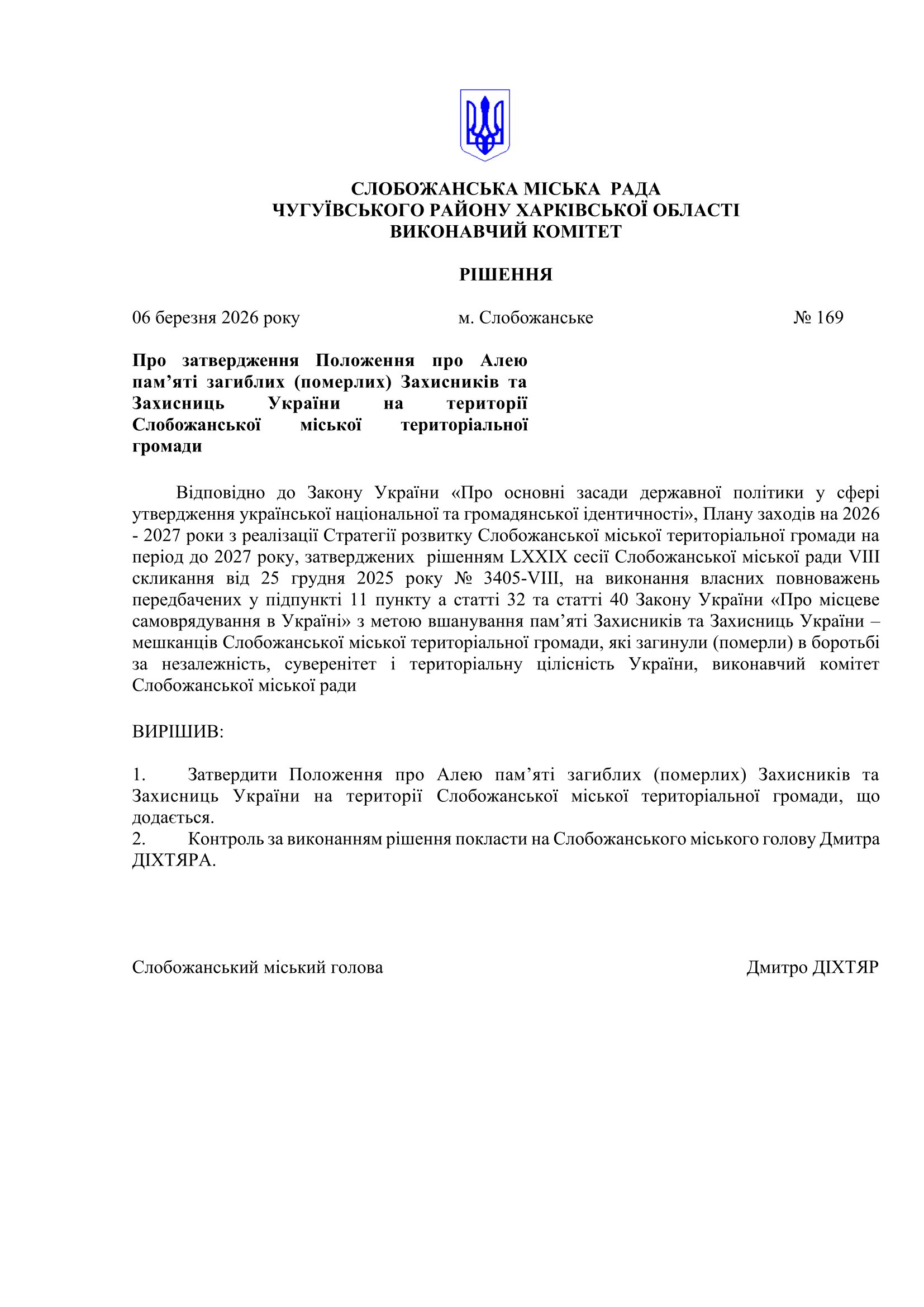 Рішення виконавчого комітету №169 Про затвердження Положення про Алею пам’яті загиблих (померлих) Захисників та Захисниць України на території Слобожанської міської територіальної громади.