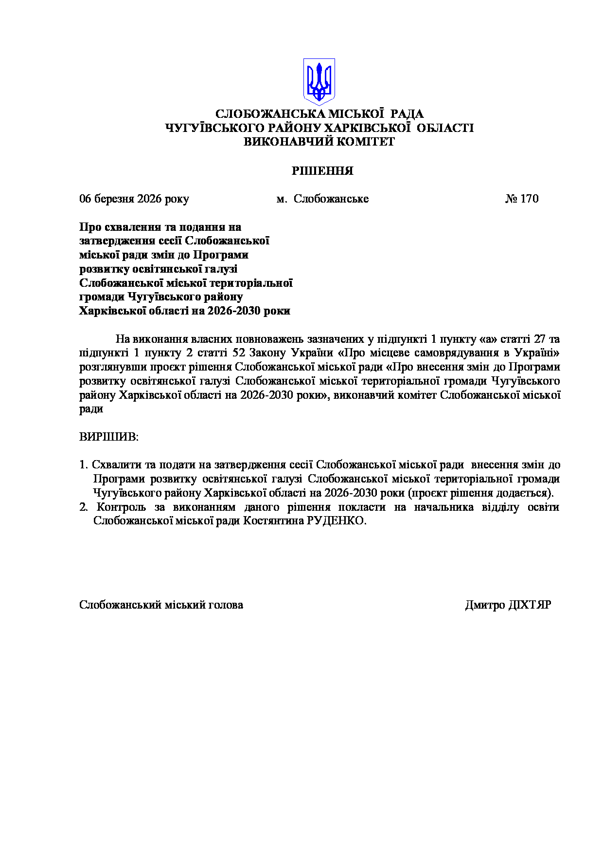 Рішення виконавчого комітету №170 Про схвалення та подання на затвердження сесії Слобожанської міської ради змін до Програми розвитку освітянської галузі Слобожанської міської територіальної громади Чугуївського району Харківської області на 2026-2030 роки.