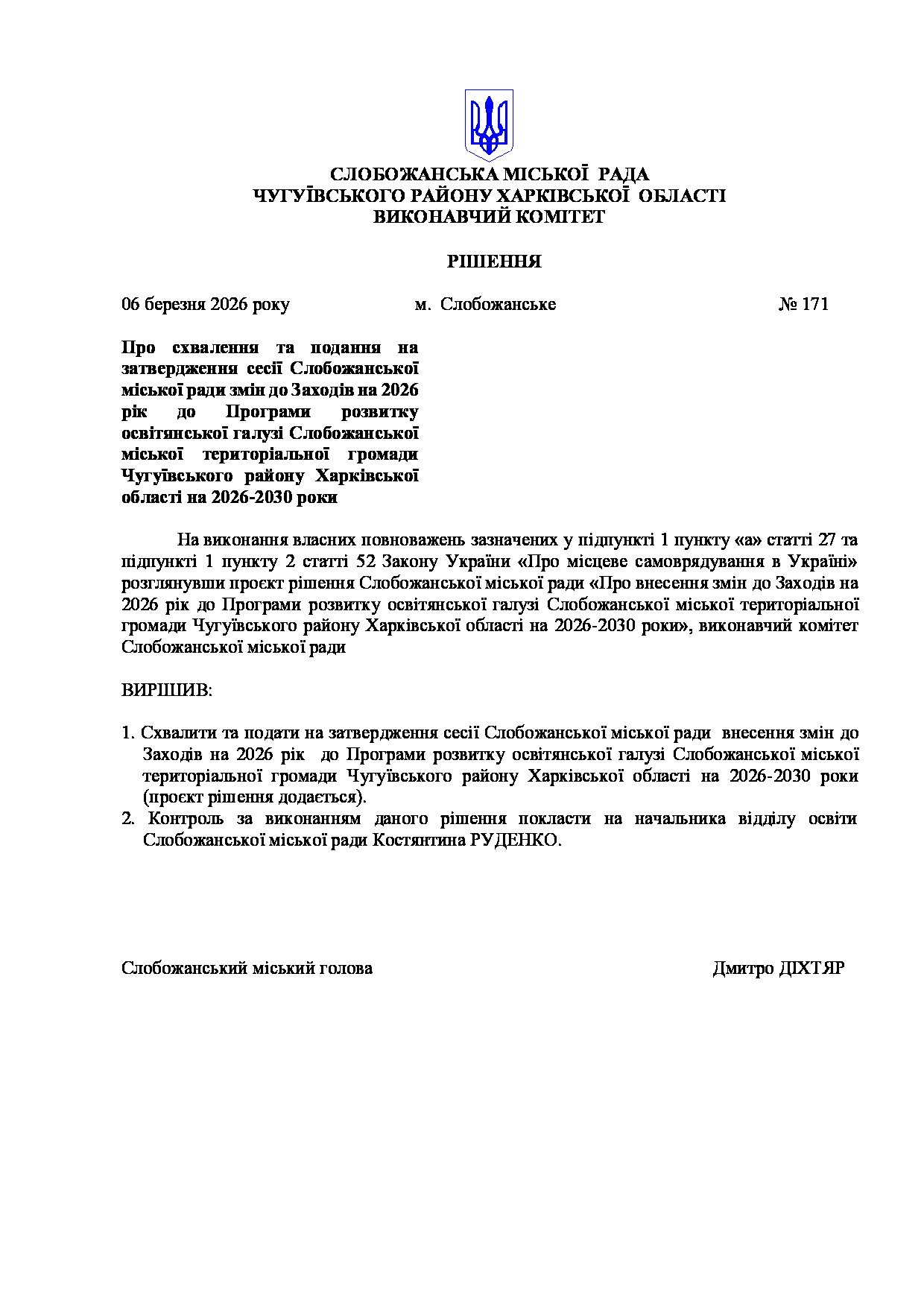 Рішення виконавчого комітету №171 Про схвалення та подання на затвердження сесії Слобожанської міської ради змін до Заходів на 2026 рік до Програми розвитку освітянської галузі Слобожанської міської територіальної громади Чугуївського району Харківської області на 2026-2030 роки.