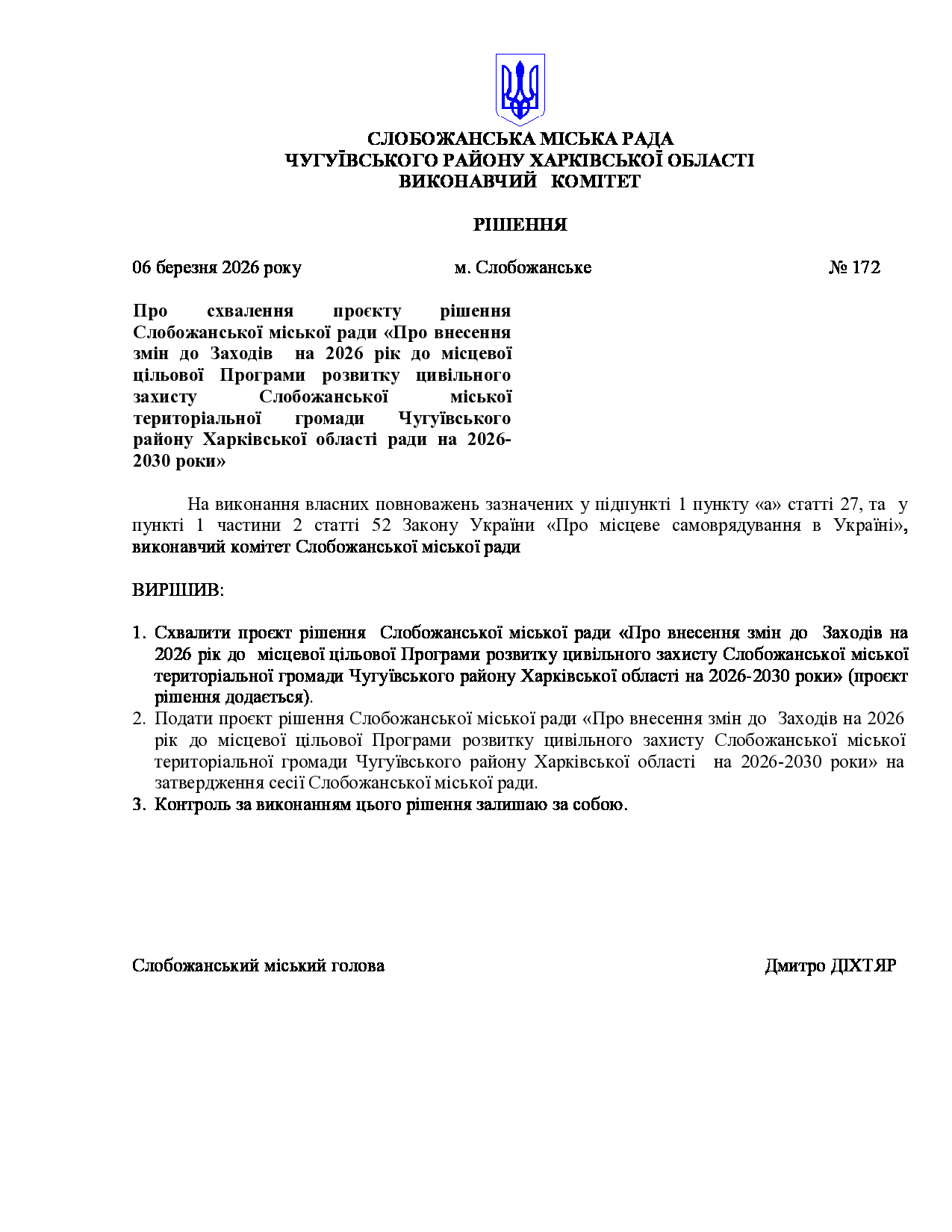 Рішення виконавчого комітету №172 Про схвалення проєкту рішення Слобожанської міської ради «Про внесення змін до Заходів на 2026 рік до місцевої цільової Програми розвитку цивільного захисту Слобожанської міської територіальної громади Чугуївського району Харківської області ради на 2026-2030 роки».