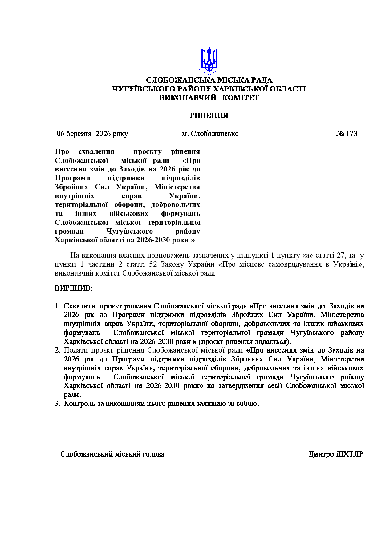 Рішення виконавчого комітету №173 Про схвалення проєкту рішення Слобожанської міської ради «Про внесення змін до Заходів на 2026 рік до Програми підтримки підрозділів Збройних Сил України, Міністерства внутрішніх справ України, територіальної оборони, добровольчих та інших військових формувань Слобожанської міської територіальної громади Чугуївського району Харківської області на 2026-2030 роки »