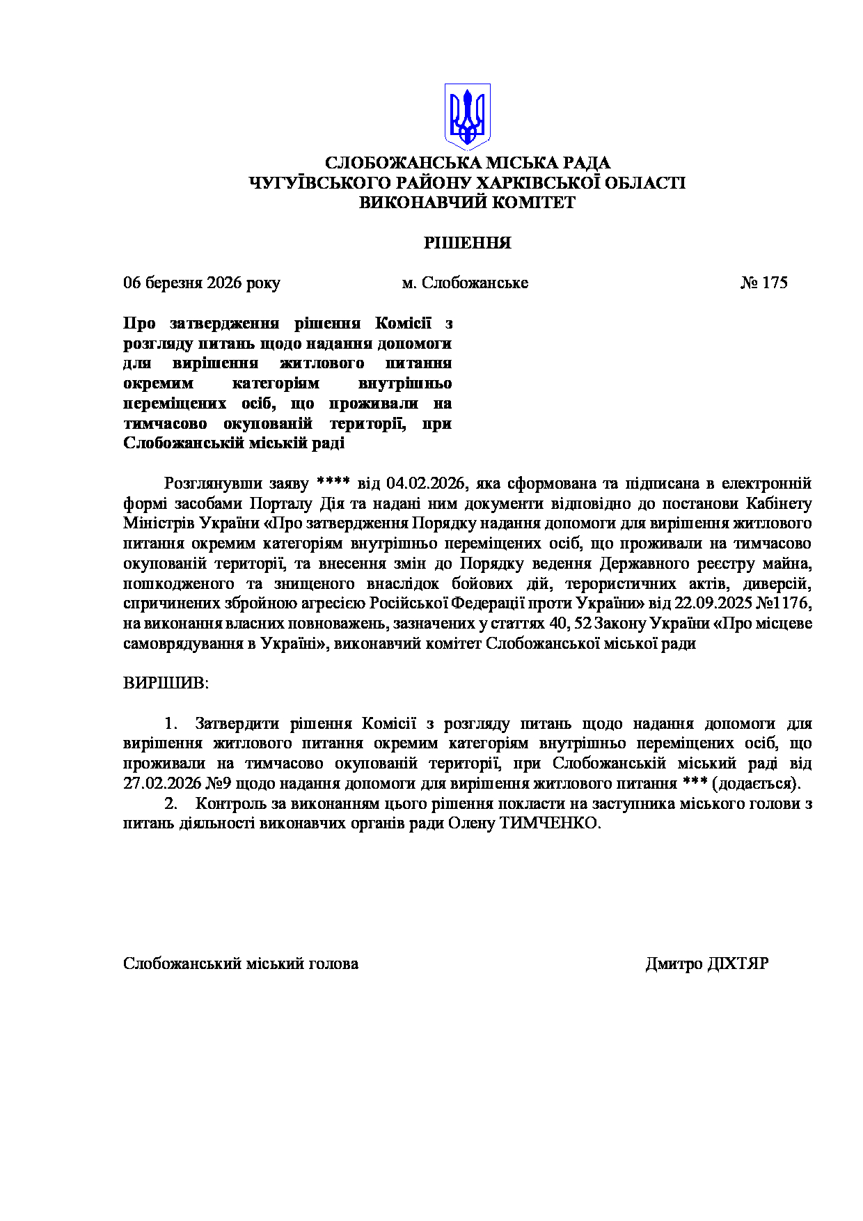 Рішення виконавчого комітету №175 Про затвердження рішення Комісії з розгляду питань щодо надання допомоги для вирішення житлового питання окремим категоріям внутрішньо переміщених осіб, що проживали на тимчасово окупованій території, при Слобожанській міській раді.