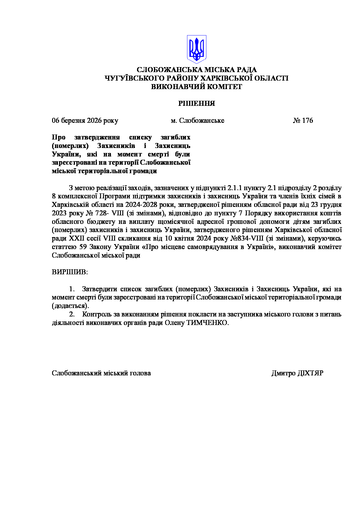 Рішення виконавчого комітету №176 Про затвердження списку загиблих (померлих) Захисників і Захисниць України, які на момент смерті були зареєстровані на території Слобожанської міської територіальної громади.