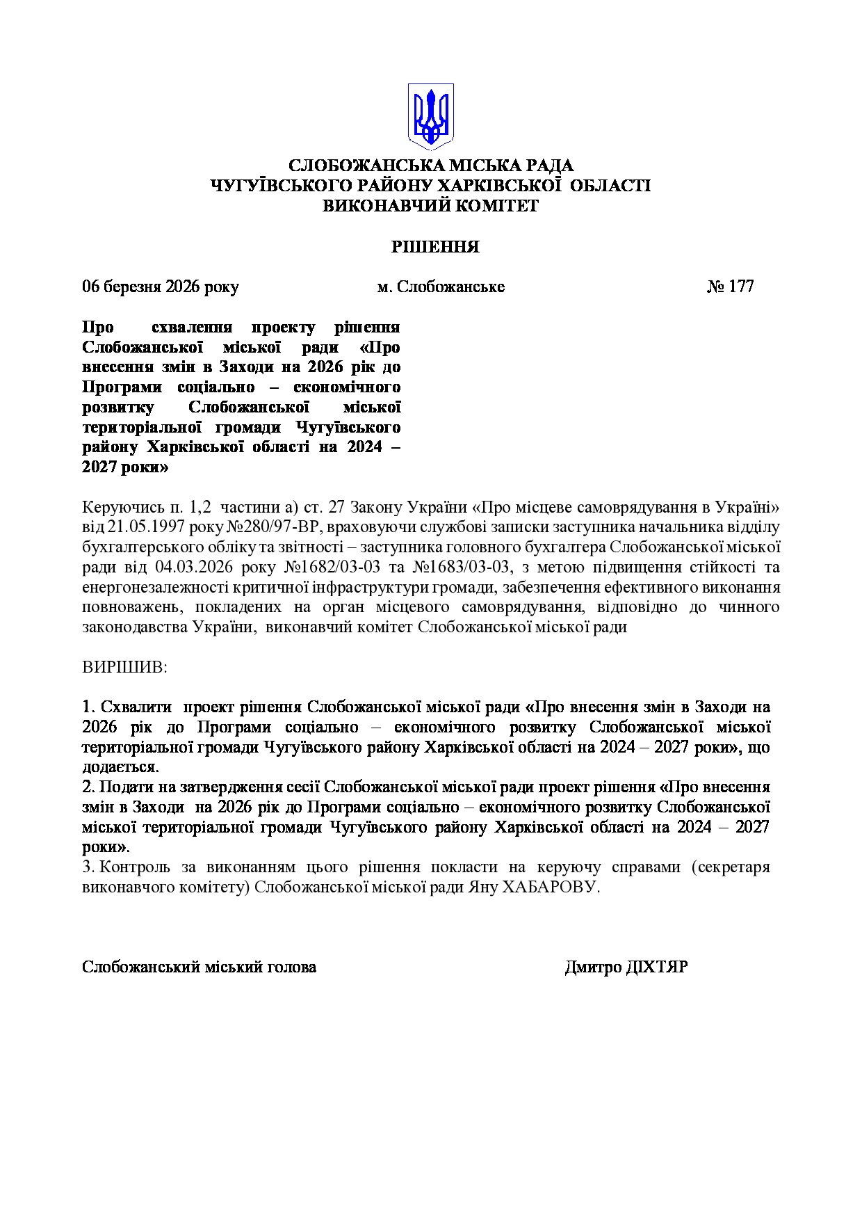 Рішення виконавчого комітету №177 Про схвалення проекту рішення Слобожанської міської ради «Про внесення змін в Заходи на 2026 рік до Програми соціально – економічного розвитку Слобожанської міської територіальної громади Чугуївського району Харківської області на 2024 –2027 роки».