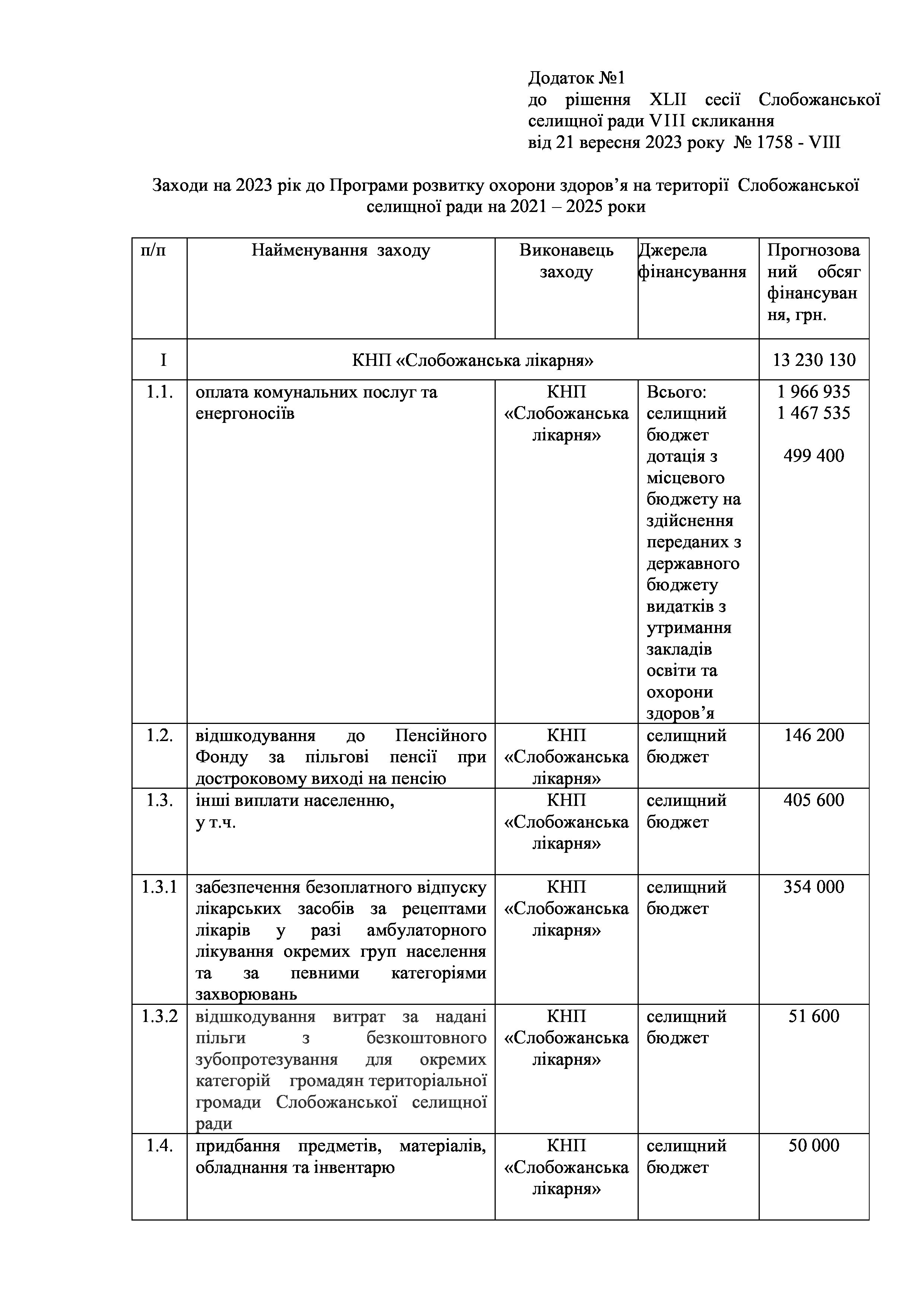 Рішення сесії №1758-VIII Про внесення змін та доповнень до Заходів на 2023 рік до Програми розвитку охорони здоров’я на території Слобожанської селищної ради на 2021 - 2025 роки.