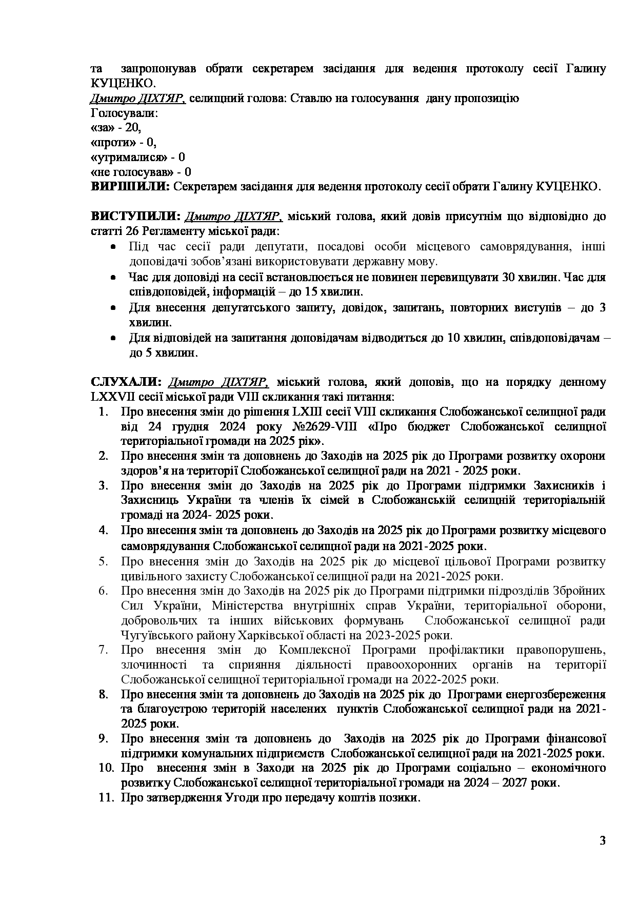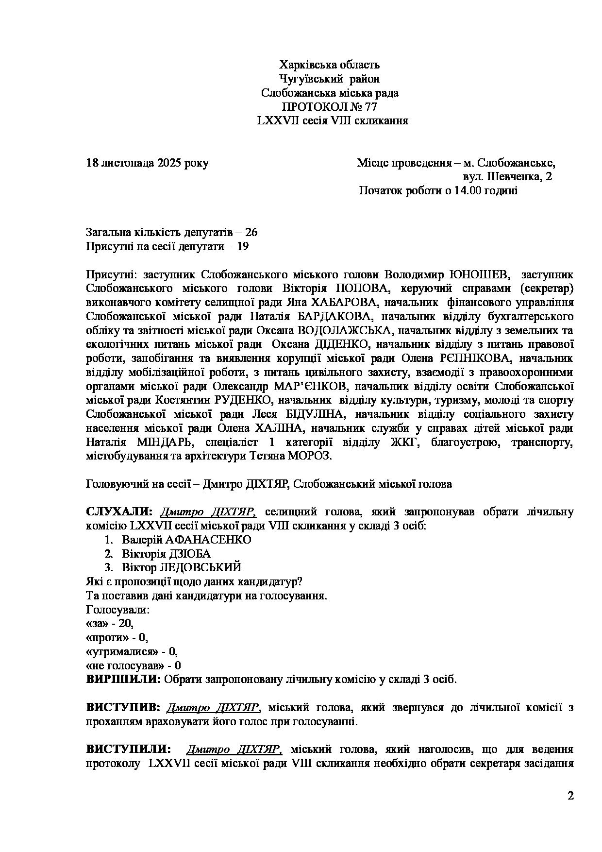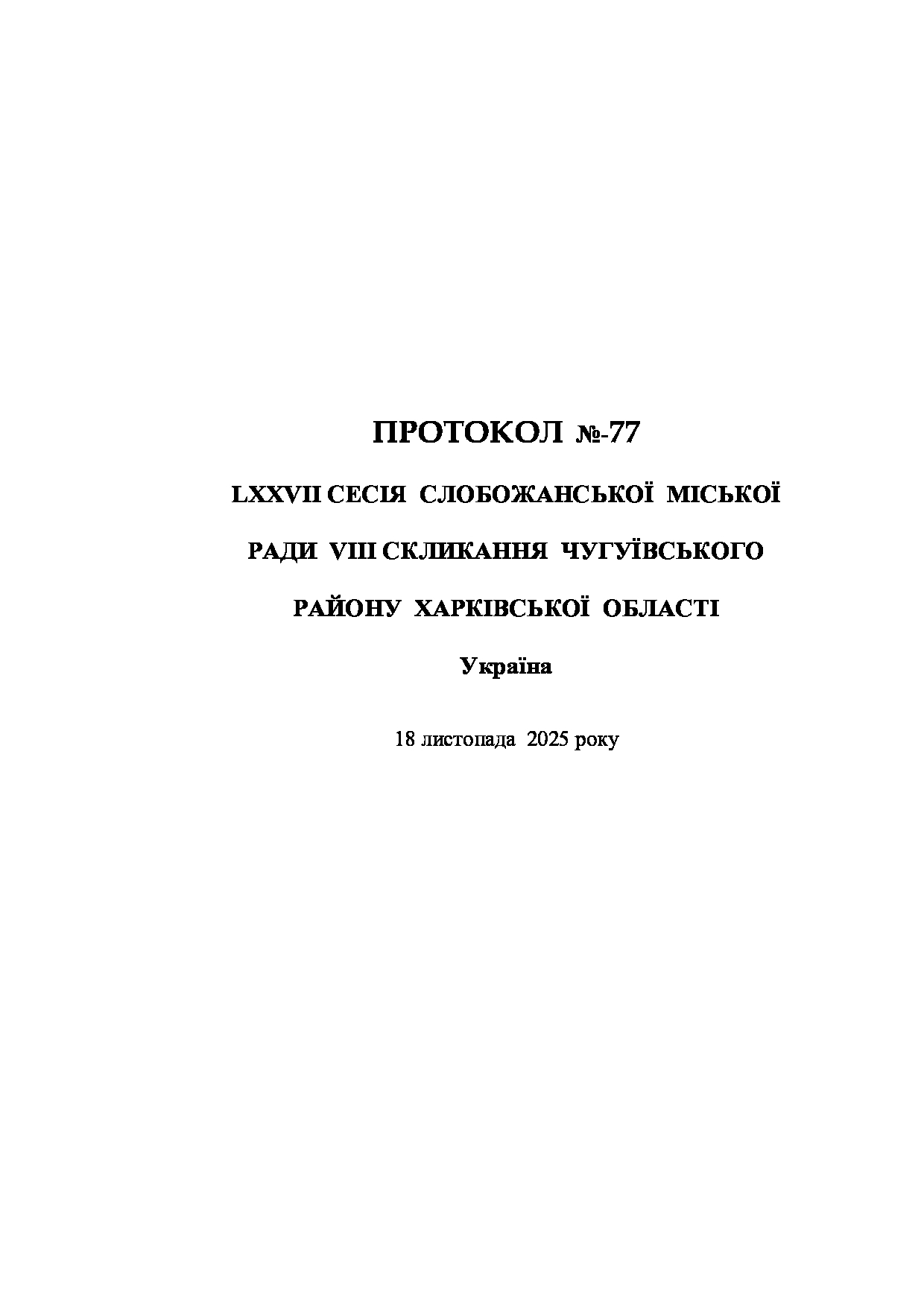 Протокол № 77 засідання LХXVII сесії Слобожанської міської ради VIII скликання Чугуївського району Харківської області