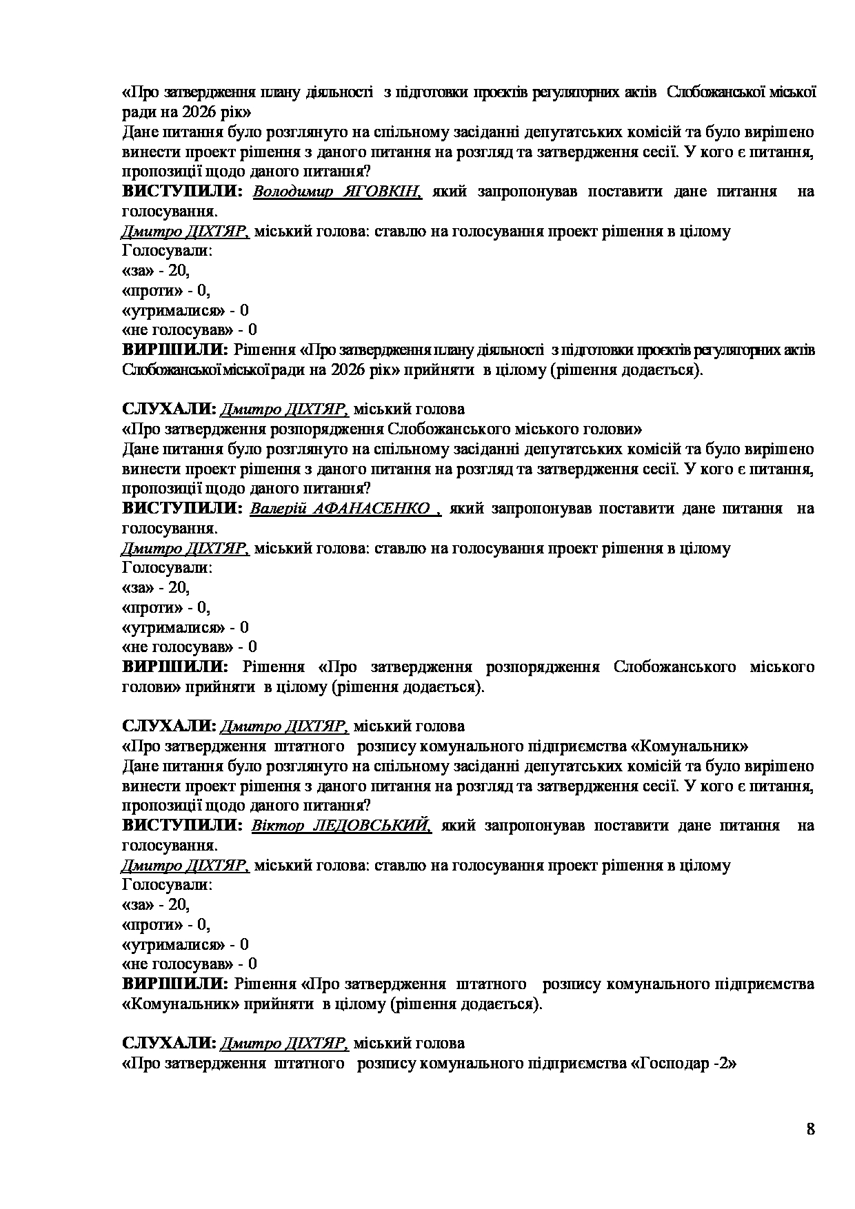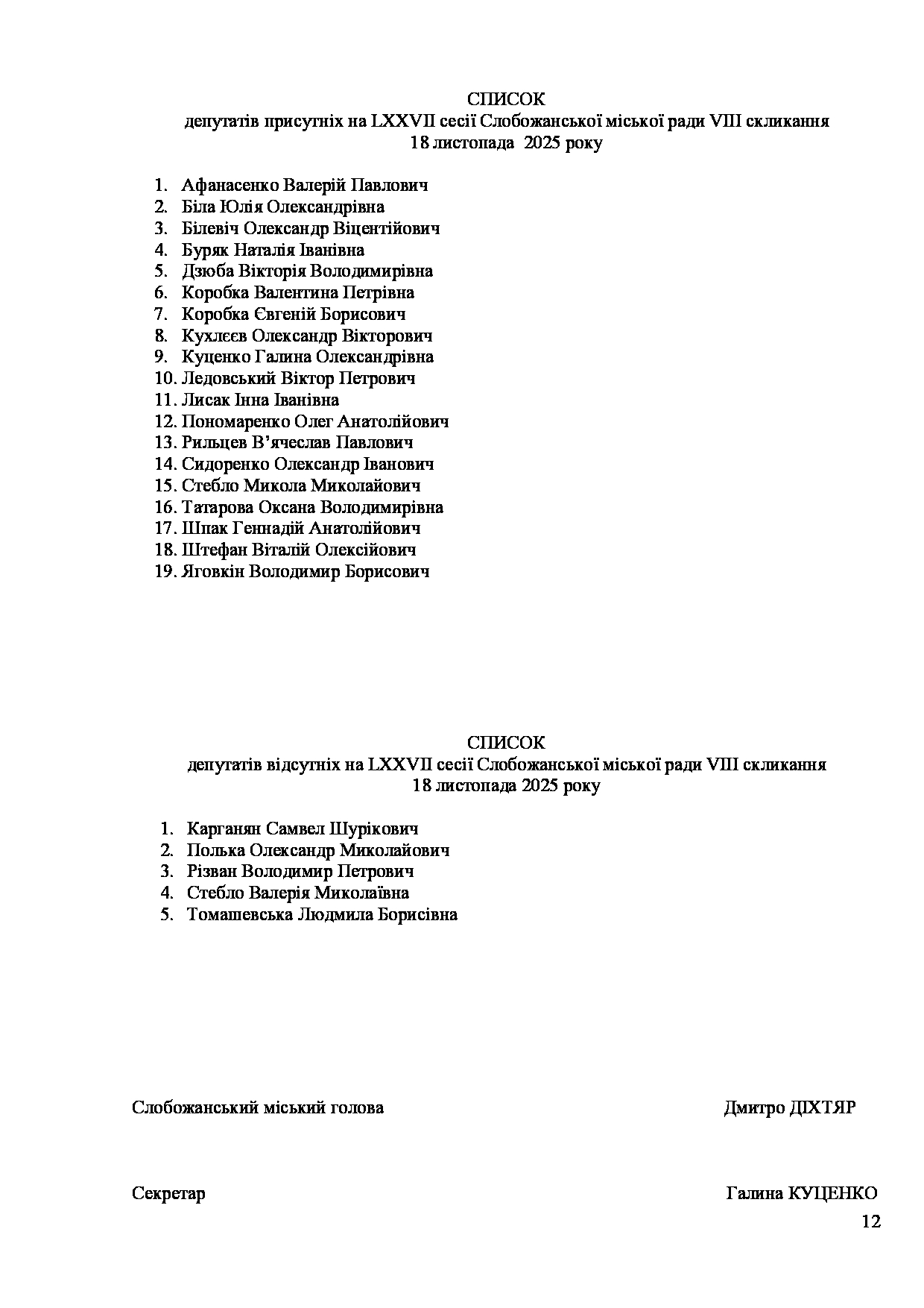 • Відомість голосування голови та депутатів міської ради на засіданні LXXVII cесії Слобожанської міської ради VIII скликання від 18 листопада 2025 року