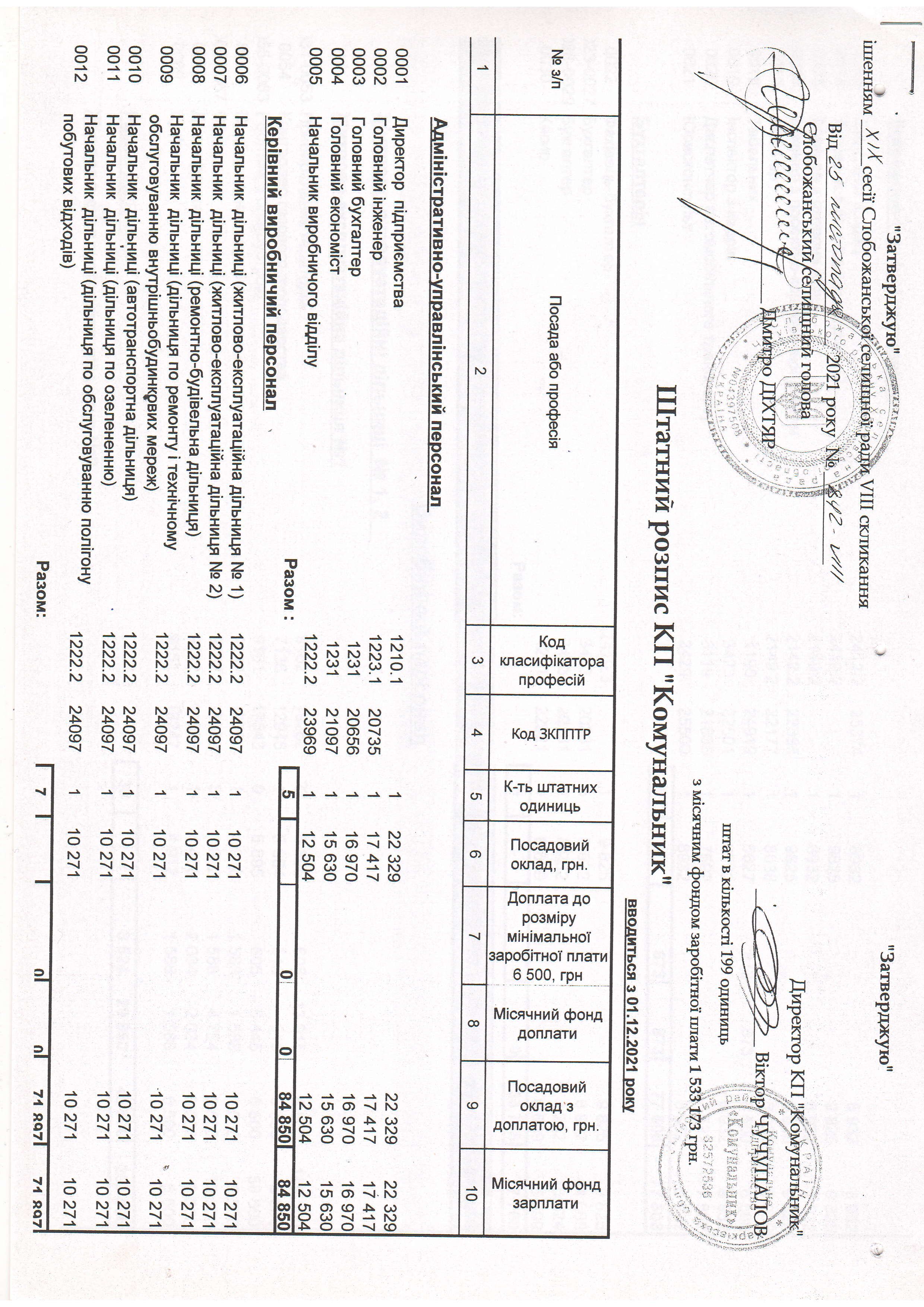 Рішення сесії № 842 - VIII Про затвердження штатного розпису комунального підприємства «Комунальник» з 01 грудня 2021 року.
