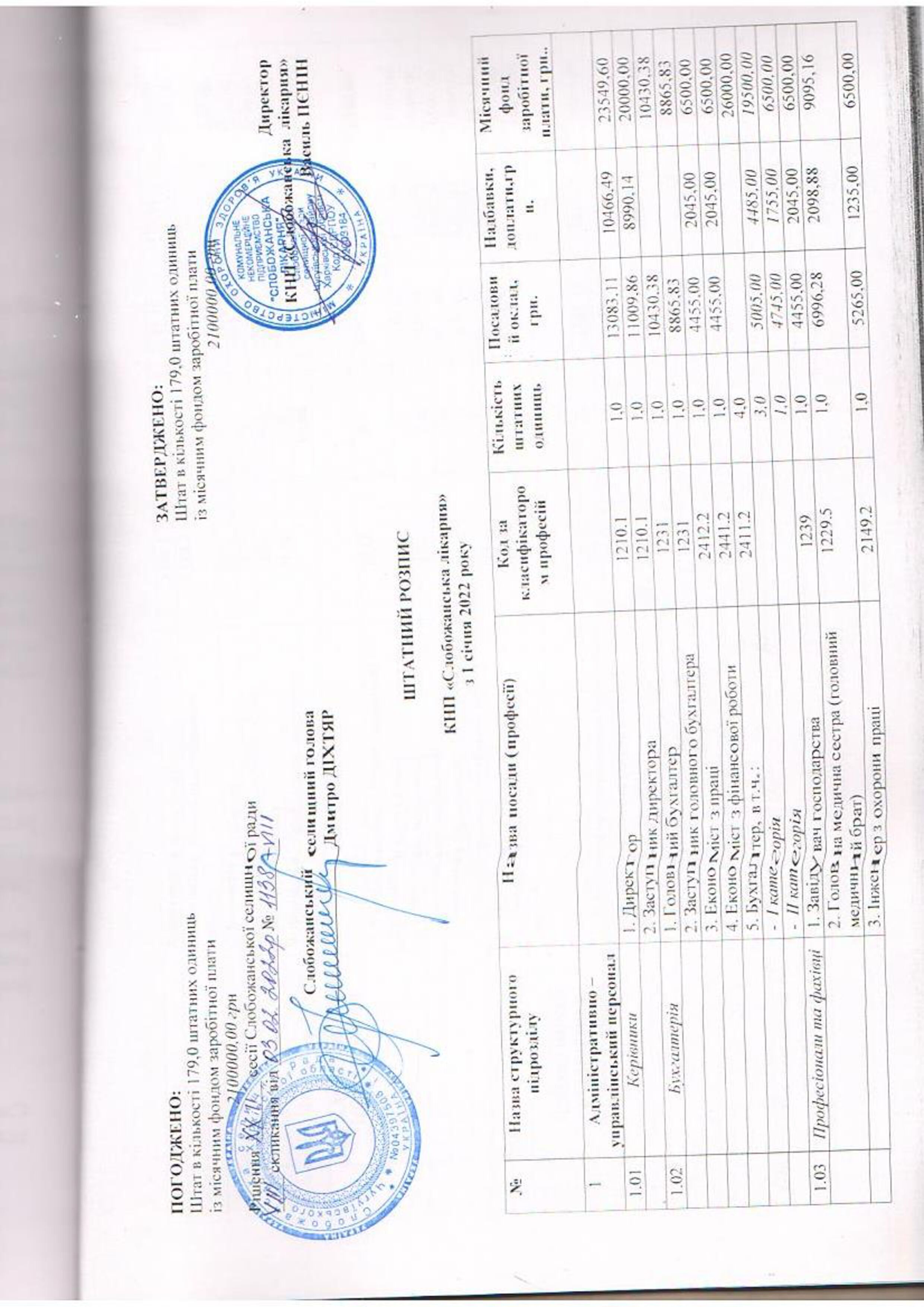 Рішення сесії №1138 - VIII Про погодження штатного розпису та штатної чисельності комунального некомерційного підприємства «Слобожанська лікарня» Слобожанської селищної ради Чугуївського району Харківської області з 01.01.2022 року.