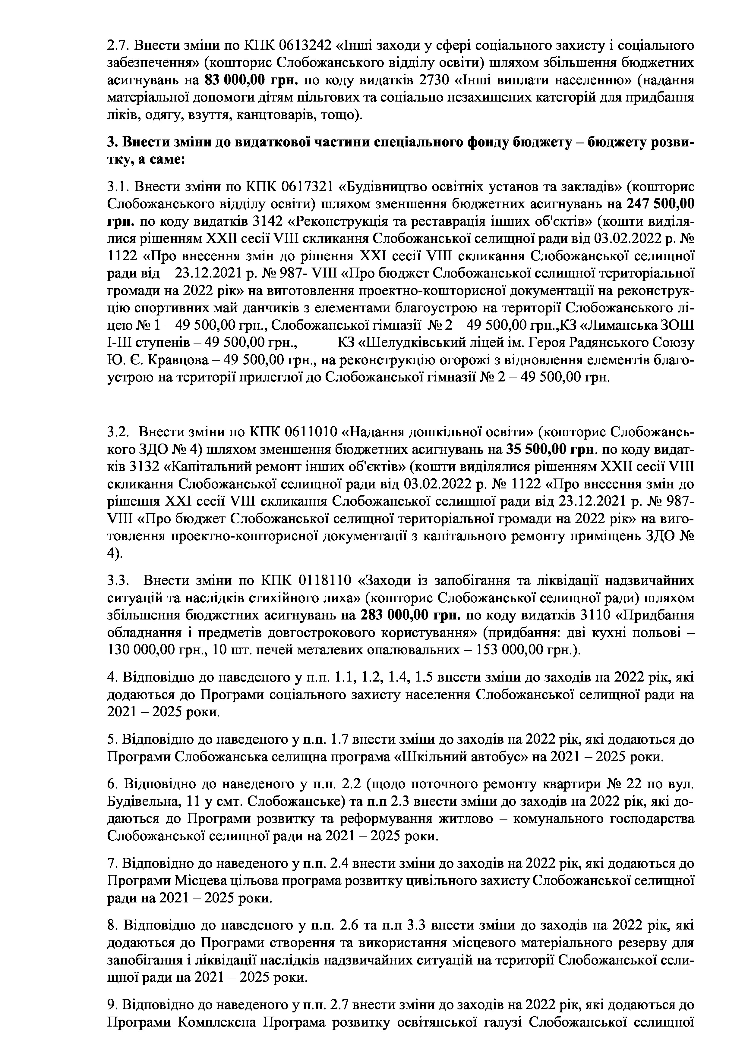 Рішення сесії №1302-VIII Про внесення змін до Заходів на 2022 рік до Програми з оздоровлення та відпочинку дітей Слобожанської селищної ради на 2022 -2025 роки.