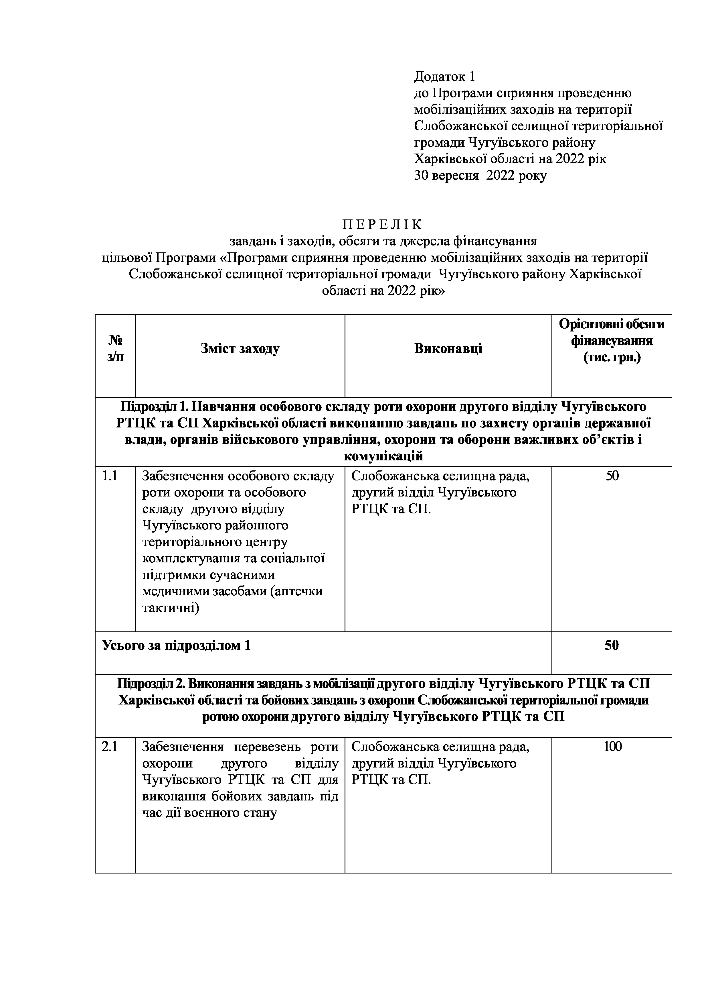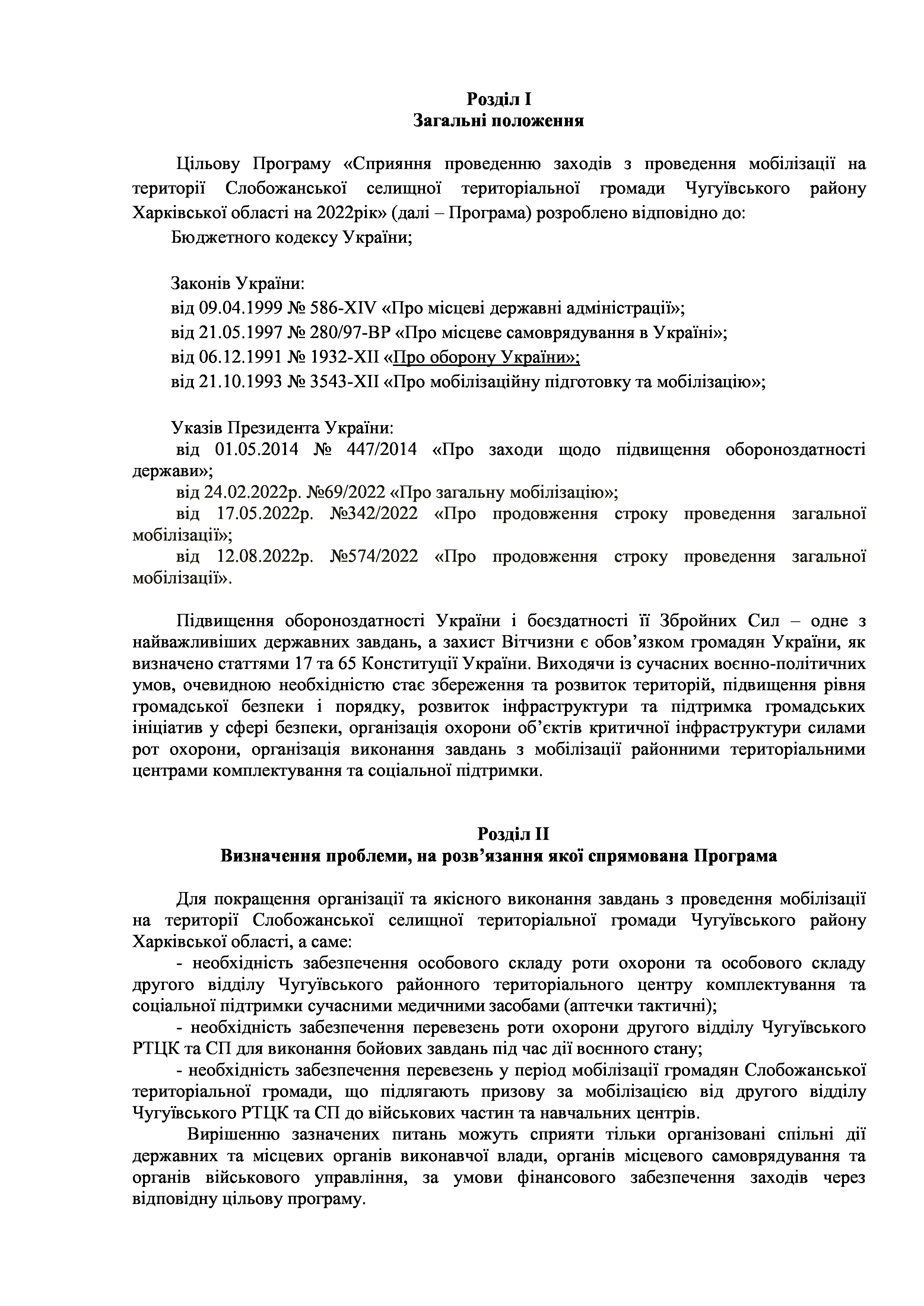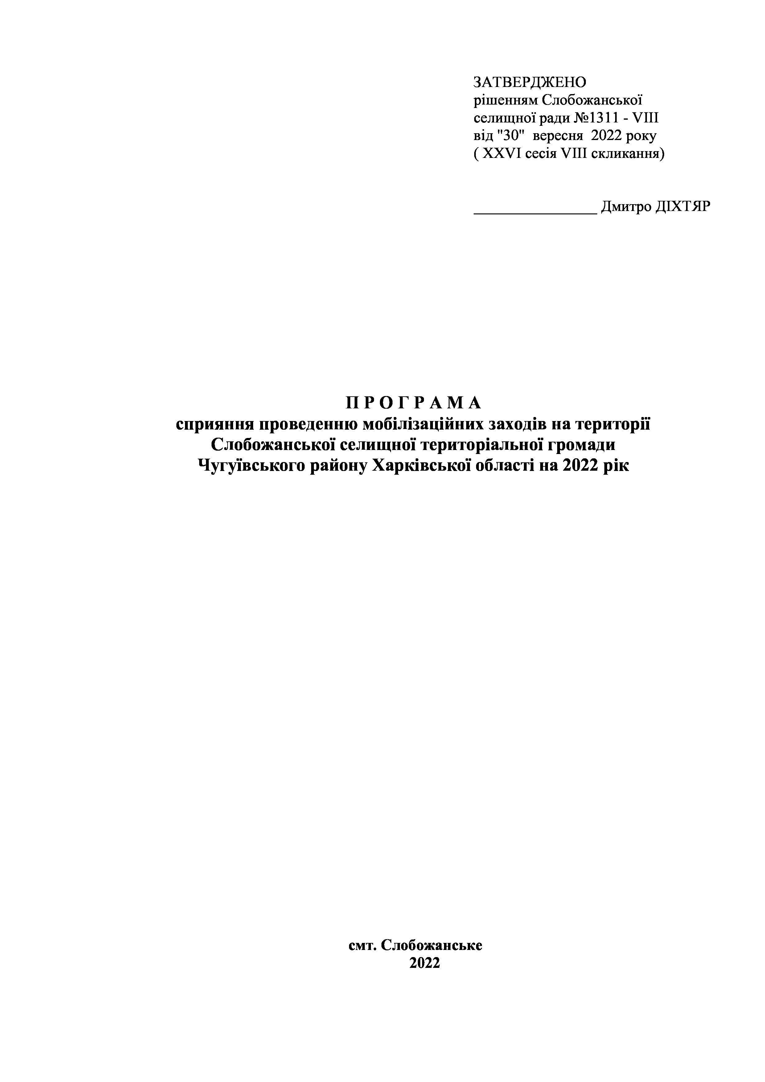 Рішення сесії №1311-VIII Про затвердження Програми сприяння проведення мобілізаційних заходів на території Слобожанської селищної ради Чугуївського району Харківської області на 2022 рік.