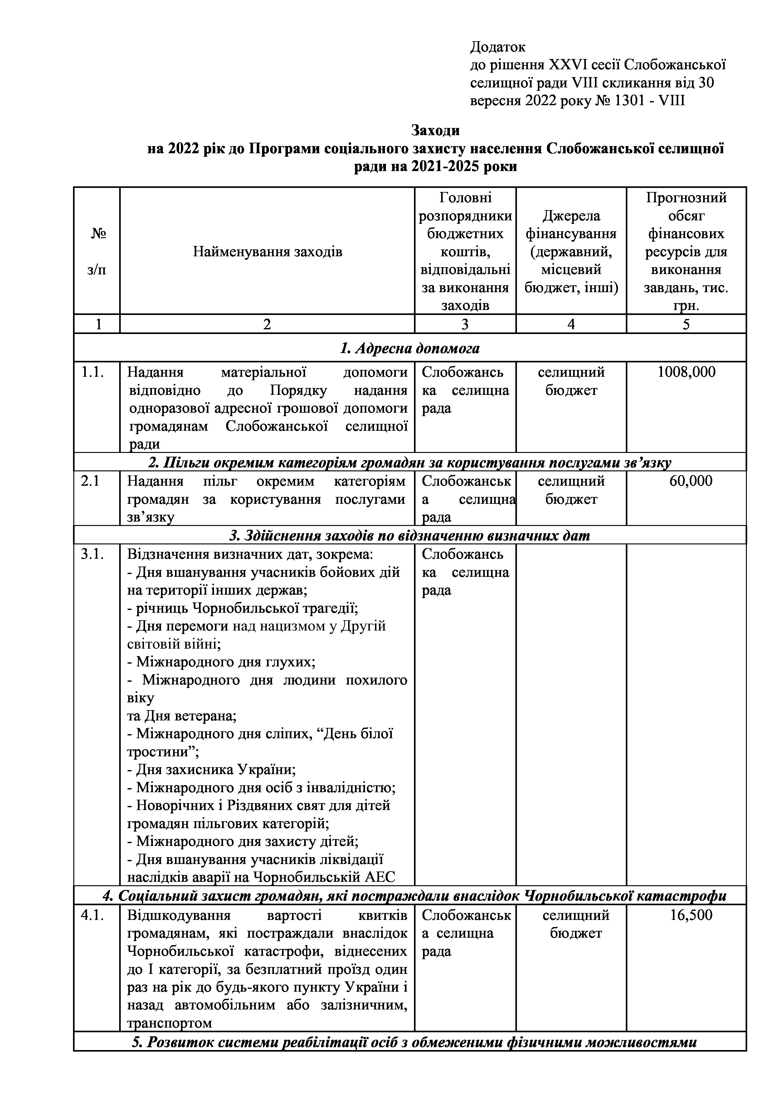 Рішення сесії №1301-VIII Про внесення змін до Заходів на 2022 рік до Програми соціального захисту населення Слобожанської селищної ради на 2021 -2025 роки.